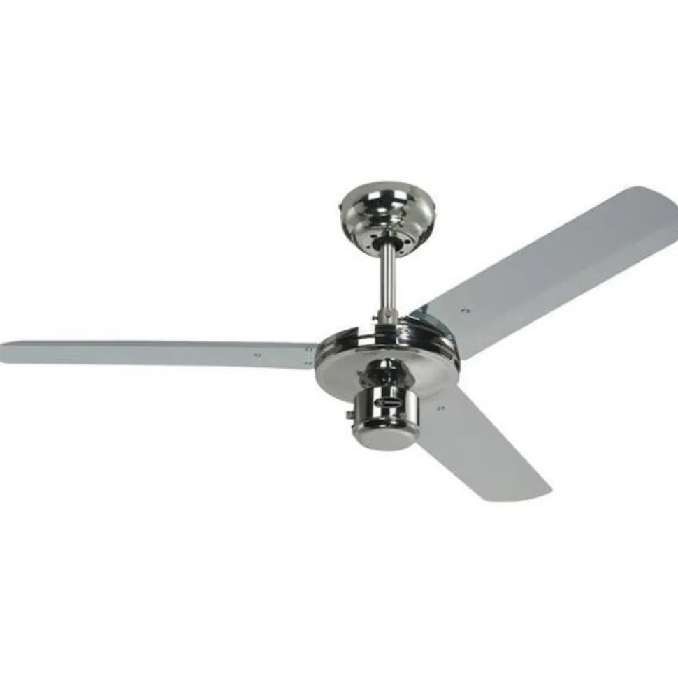 Industriële plafondventilator met drie bladen en een elegante chroomlook De industriële plafondventilator van Westinghouse, die geschikt is voor kamers met een woonoppervlak tot 20 m², heeft een slanke en elegante uitstraling. De metalen behuizing is afgewerkt in chique chroom. De drie bladen in grijs vullen het smaakvolle ontwerp aan. Functies De drietrapsbediening wordt bediend met een geïntegreerde trekschakelaar. Kan worden uitgebreid met een wandschakelaar of afstandsbediening. (Als de vlakke plafonds hoger zijn dan 3,5 m, moet een verlengstuk worden gebruikt (zie accessoires). Een schuifregelaar stelt de voorwaartse of achterwaartse werking in. Deze omschakeling van een voorwaarts draaiende zomerfunctie naar een achterwaarts draaiende winterfunctie komt overeen met de omschakeling van koeleffect naar warmtecirculatie. Dit laatste helpt om maximaal 30% te besparen op verwarmingsenergiekosten. Technische gegevens Vermogen per snelheid: – 55 watt bij 260 tpm – 35 watt bij 195 tpm – 55 watt bij 240 tpm Speciale kenmerken Met zijn zeer stille motor is de industriële plafondventilator ideaal voor het verfrissen van slaapkamers.