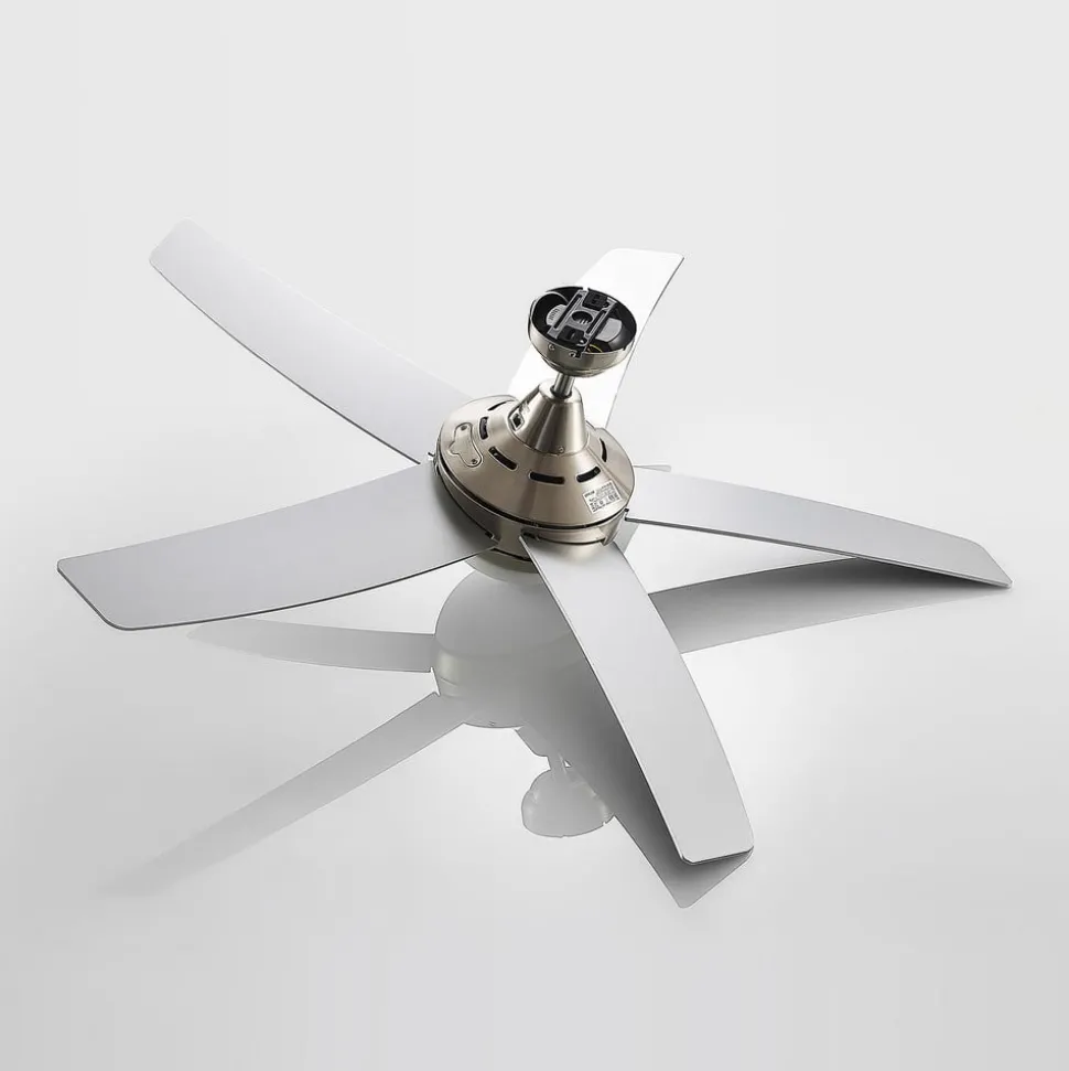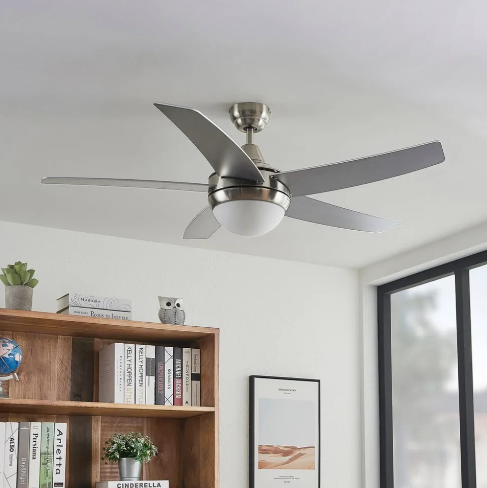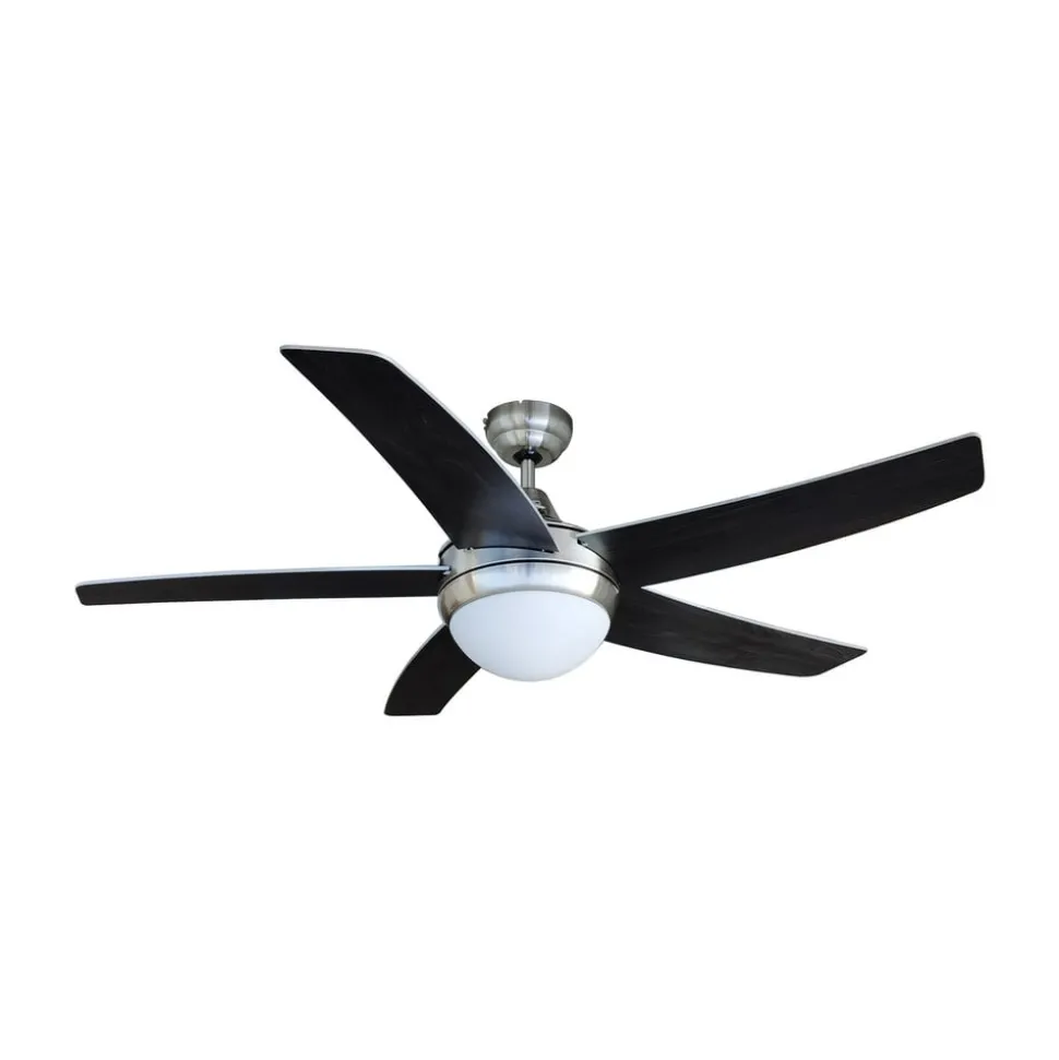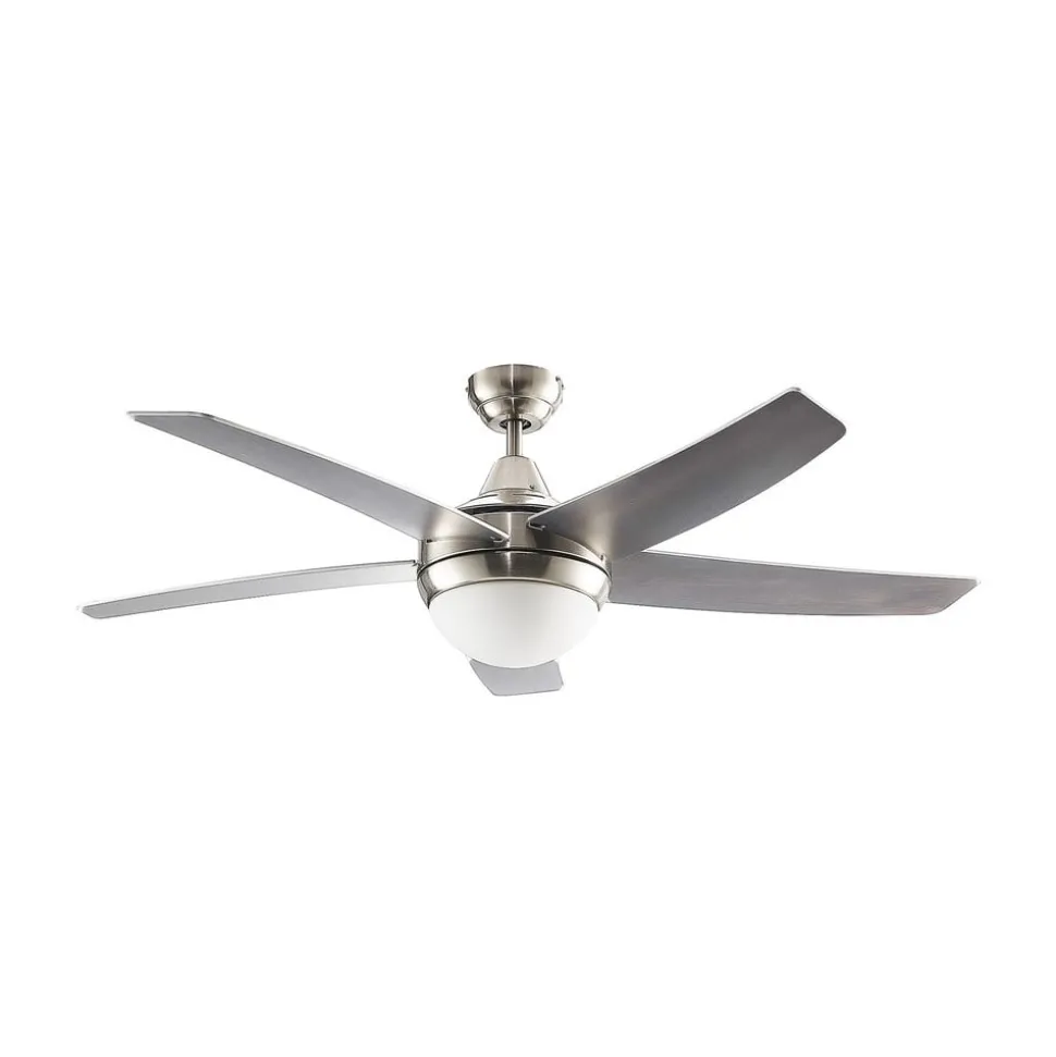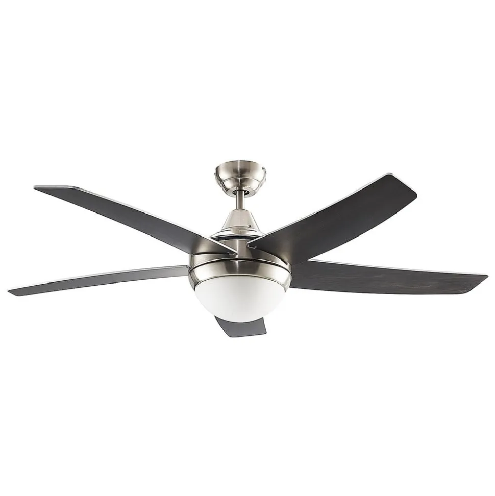 Praktische plafondventilator Auraya in grijs en zwart met vijf bladen De plafondventilator is gemaakt van staal, hout en glas. De vijf bladen omringen een diffuser waarachter passende lampen kunnen worden geplaatst. Het ontwerp heeft een harmonieus kleurcontrast van grijs en zwart en rondt het moderne ontwerp mooi af. De rotorbladen hebben aan beide zijden een elegante kleur: zwart of grijs/staal-look. Je beslist zelf aan welke kant je de voorkeur geeft. Functies De plafondventilator Auraya kan worden bediend met de meegeleverde afstandsbediening. Hiermee kun je eenvoudig de rotatie en het licht aanpassen. Je kunt ook overschakelen van vooruit naar achteruit met een schakelaar op de behuizing.