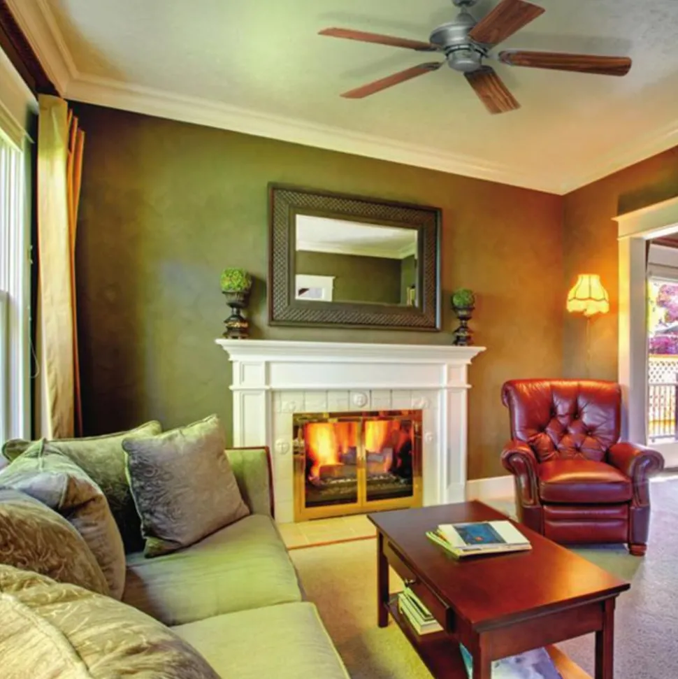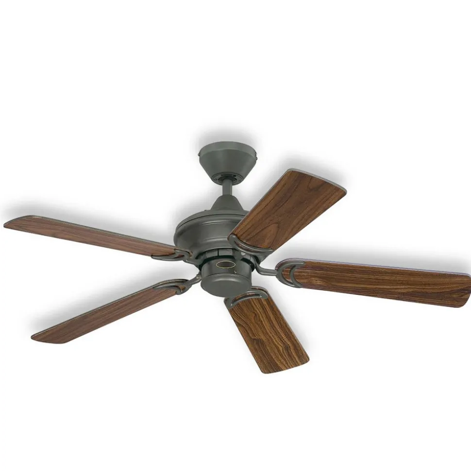 Solide ontworpen plafondventilator Nevada met winterfunctie om verwarmingskosten te verlagen De plafondventilator Nevada van hoogwaardig staal en kunststof heeft een solide ontwerp. Het ventilatorhuis heeft een antieke ijzeren look. De draaiende bladen hebben aan de ene kant een kersenhoutlook coating en aan de andere kant een walnoothoutlook. Dit maakt de ventilator ideaal voor gebruik op lambriseringplafonds of in interieurstijlen met elegante houten meubels. Functies De ventilator kan worden bediend met een praktische trekschakelaar. Indien nodig kan hij achteraf worden uitgerust met een wandschakelaar of afstandsbediening – zie het hoofdstuk accessoires. Het hoogtepunt is de dubbele bruikbaarheid voor zomer- en winterwerking. In de zomerfunctie draaien de ventilatorbladen tegen de klok in om koellucht te laten circuleren. In de winterfunctie draaien de draaiende bladen met de klok mee en circuleren ze de warme lucht die is opgestegen terug de kamer in. Dit kan tot 30 % besparen op verwarmingskosten. De ventilator kan in drie vermogens- en snelheidsniveaus worden gebruikt. Technische gegevens Vermogen per snelheid: – 24 watt bij 115 tpm – 29 watt bij 165 tpm – 48 watt bij 215 tpm