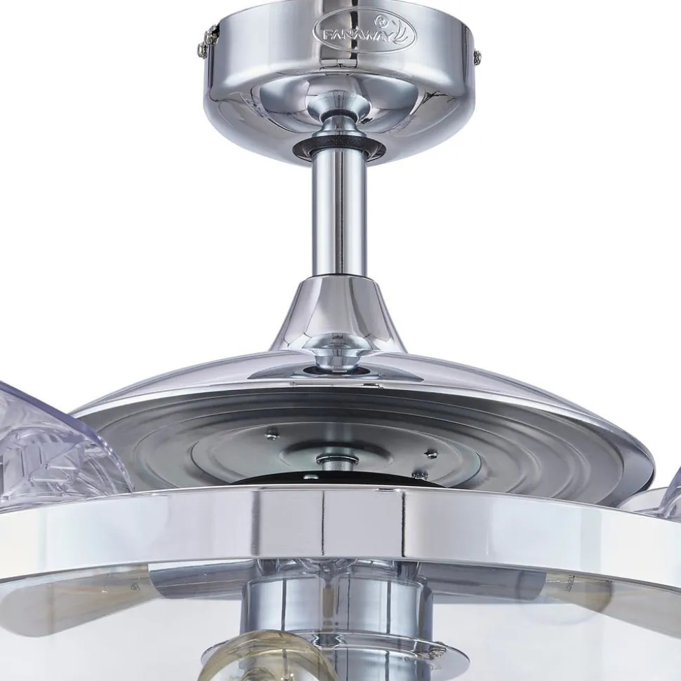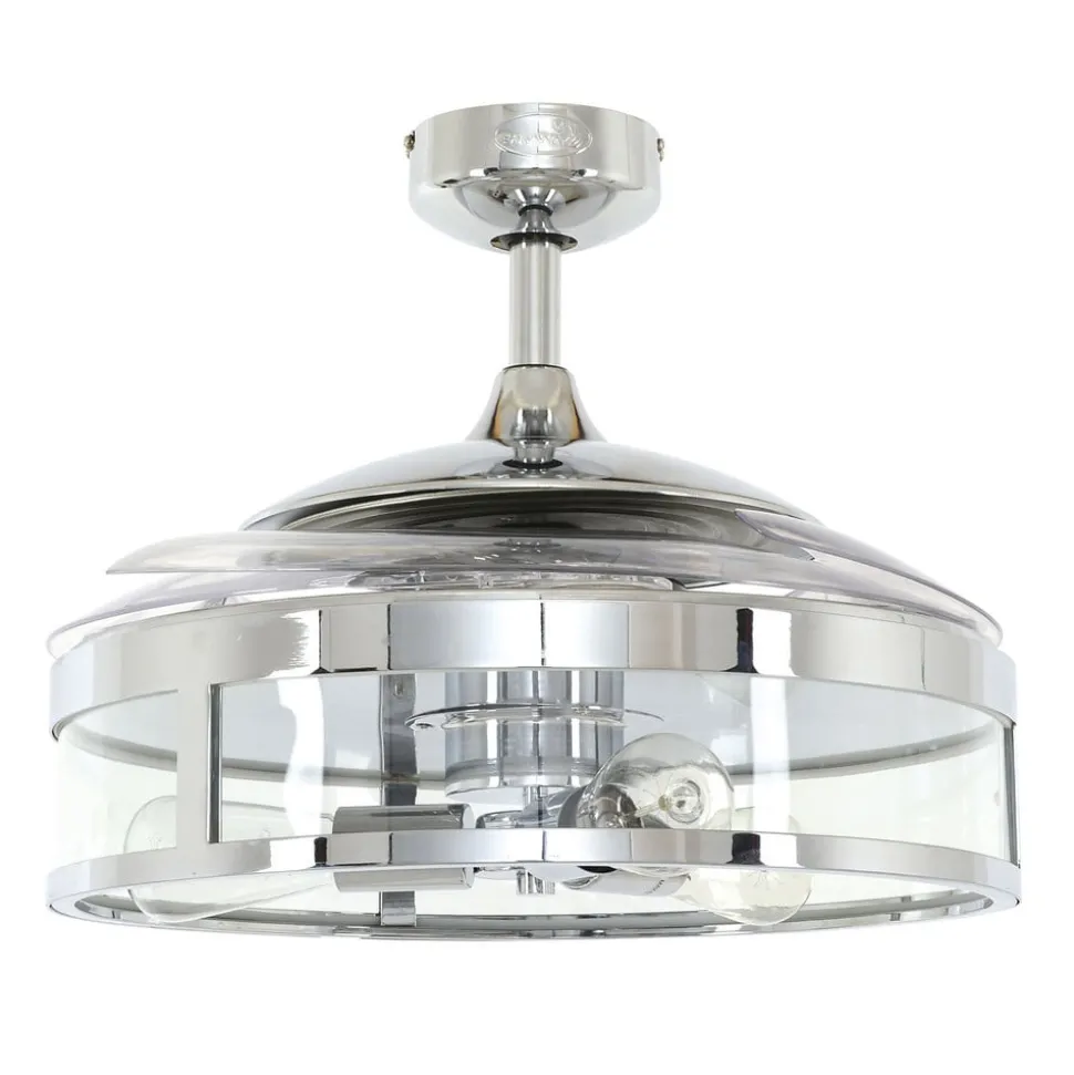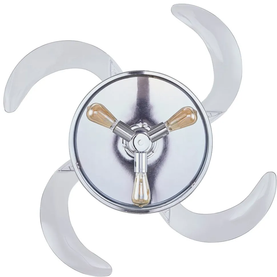 Ombouwbare plafondventilator Fanaway Classic met verchroomde behuizing en heldere schoepen Als ventilator, als eenvoudige plafondlamp of als beide tegelijk – Fanaway Classic is een praktisch interieurelement. De afwerking en de fitting met drie LED rustiek lampen ST64 in gloeilampoptiek maken de plafondventilator tot een blikvanger. Functies Met drie snelheidsstanden kan de luchtcirculatie worden aangepast aan de omstandigheden in de kamer. De plafondventilator belooft zowel verkoeling in de zomer als besparingen op de verwarmingskosten in de winter, omdat de omgekeerde draairichting de verwarmde lucht die onder het plafond gevangen zit, terugvoert naar de bezette ruimte. De plafondventilator Fanaway Classic wordt bediend met de meegeleverde afstandsbediening (vereist 2 x AAA-batterijen – zie accessoires).