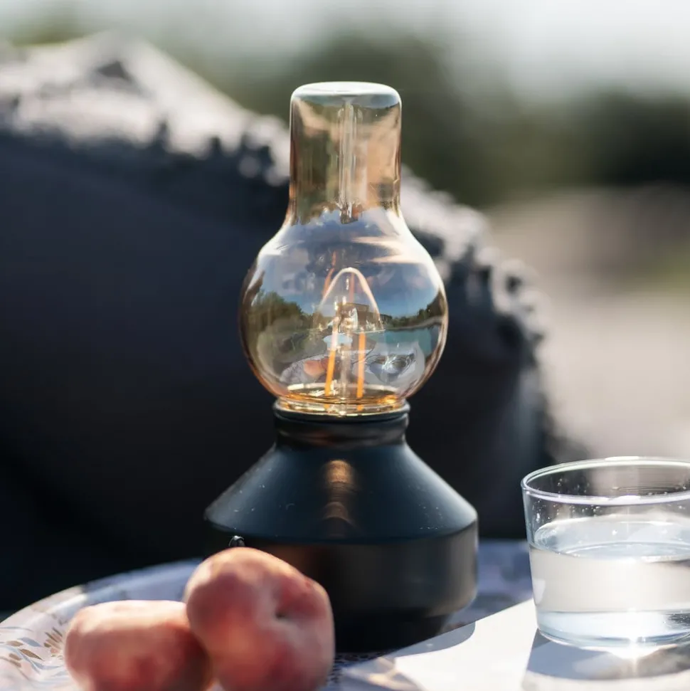 Decoratieve Glimt LED terraslamp met oplaadbare batterij Glimt is een tafellamp voor binnen en buiten (IP44) die overal kan worden gebruikt dankzij de oplaadbare batterij. Het ontwerp is gemodelleerd naar een oude olielamp met een zwarte metalen behuizing en amberkleurig transparant glas. De lithium-ion batterij wordt opgeladen via een USB-C aansluiting (oplaadkabel inbegrepen). Afhankelijk van het dimniveau spot het extra warmwit licht tot 8 uur, terwijl een volledige oplaadbeurt (uit te voeren in een droge omgeving) ongeveer 4 uur duurt.