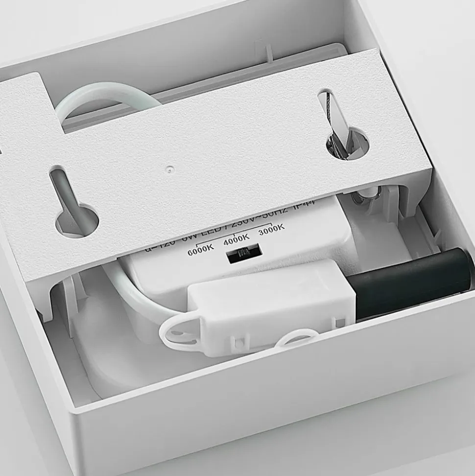 Vierkante, witte LED plafondlamp Alette, IP44, DIP-schakelaar om de lichtkleur vooraf in te stellen, dimbaar Alette is een discreet verlichtingselement voor vele omgevingen, dat tijdloos oogt met zijn witte oppervlak en hoekige Form en zowel commercieel als privé kan worden gebruikt. Die plafondlamp heeft lichtbronnen waarvan de lichtkleur voor de installatie kan worden aangepast. Hiervoor is er een DIP-schakelaar op de armatuurbehuizing die in drie standen kan worden gezet, terwijl de helderheid indien nodig met een externe dimmer kan worden aangepast. Dit maakt Alette tot een bijzonder functiegerichte lichtbron die dankzij de beschermingsgraad IP44 ook in badkamers kan worden gebruikt. De stralingshoek is relatief groot en als meerdere armaturen op een bepaalde afstand van elkaar worden gemonteerd, kunnen ook Gross ruimtes voldoende worden verlicht. – IP44 – dimbaar – DIP-schakelaar voor het vooraf instellen van de lichtkleur