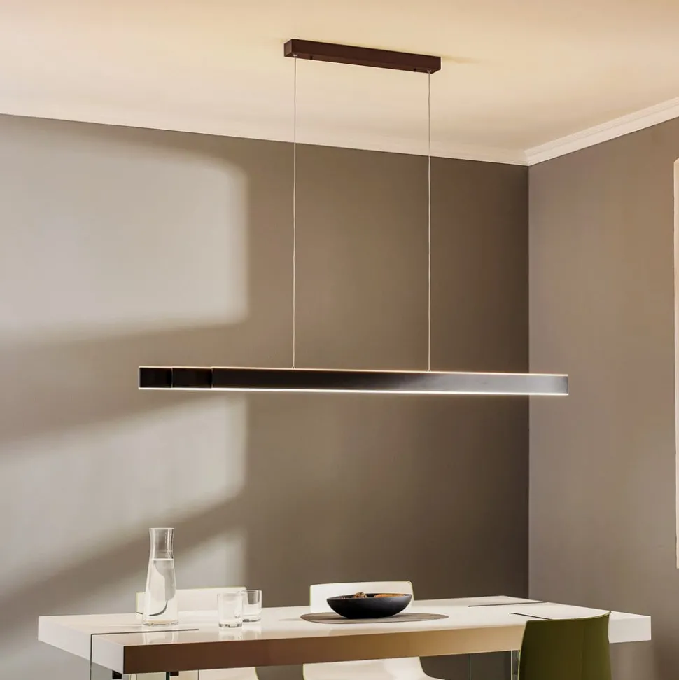 De lange en smalle LED-pendelarmatuur Pure-Lume past met haar lineaire vormgeving in vele interieurstijlen en biedt een zeer variabele verlichting, omdat de lichtkleur met de CCT-lichttechniek in drie stappen kan worden aangepast en ze bovendien traploos dimbaar is. Bovendien kan de lengte van de armatuur worden gevarieerd doordat de kap, die uit drie smalle elementen bestaat, kan worden verlengd. Het naar boven en beneden uitgestraalde licht wordt geregeld door sensoren die boven en onder in de armatuur zijn geïntegreerd. Korte bewegingen in de buurt van de sensoren regelen de lichtkleur; als de hand onder de sensor wordt gehouden, begint het dimproces, dat ophoudt zodra de hand uit de buurt van de sensor wordt gehaald. De lichtkleur kan worden ingesteld in het bereik van warm wit licht tot universeel wit licht en is traploos dimbaar.