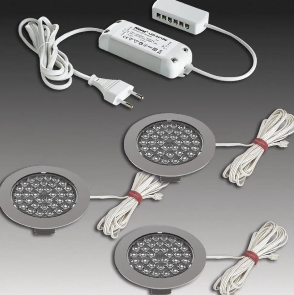 Energiebesparende, uiterst duurzame LED-inbouwspots met een gemiddelde levensduur tot 30.000 uur in de set, inclusief transformator en 2,5 meter aansluitkabel. De diameter van de installatie is 6,8 cm.