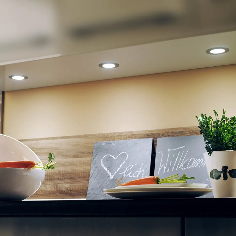 Deze LED-inbouwarmatuur wordt gekenmerkt door zijn professionele, eenvoudige vormgeving. Uitgerust met een roestvrijstalen look past deze LED-inbouwarmatuur ideaal in elk ruimteconcept waar gericht licht moet worden gebruikt – bijvoorbeeld boven kookoppervlakken, boven tafels en andere situaties. Met een inbouwdiepte van 8,5 mm (!) kan deze LED-inbouwarmatuur ook worden geïnstalleerd in dunnere planken, bijvoorbeeld onder kasten. Het product is ook geschikt voor montage op plaatstaal.