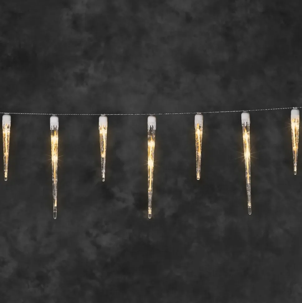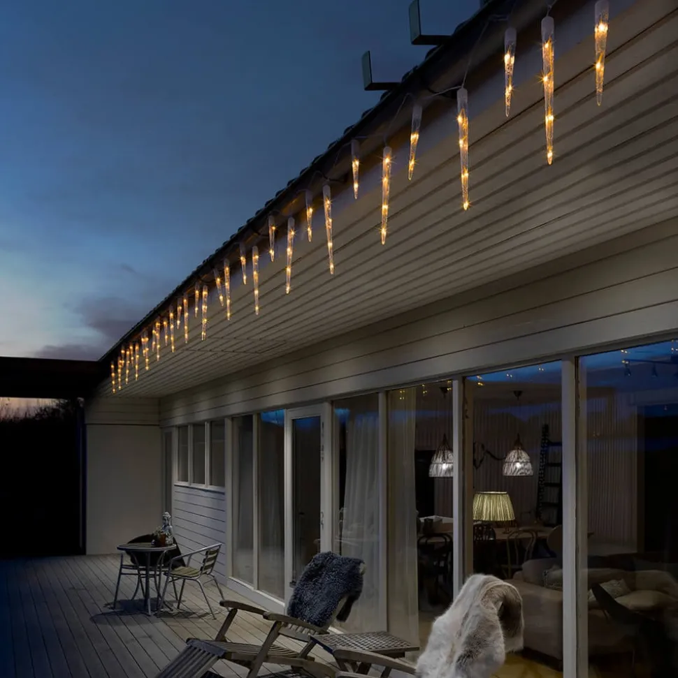 Winterse LED lichtketting met 48 ijspegels Afwisselend lange en korte ijspegels vormen deze lichtketting, die gebruikt kan worden om bijvoorbeeld de dakrand van een huis sfeervol te versieren. Die ijspegels worden verlicht door LEDs in een zeer warme amber lichtkleur. Dit creëert een sfeervolle ambiance die bewoners en voorbijgangers in kerststemming brengt. Das is wit gehouden. De buitentransformator is al bij de levering inbegrepen – Lengte van de ijspegels: 21 cm of 32 cm