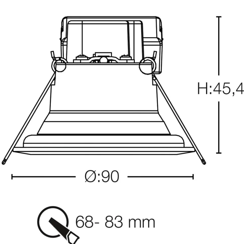 – Kan worden geïnstalleerd in plafondopeningen met Ø 6,8 tot 8,3 cm – Uitstekende kleurweergave (Cri Cri 98) – Stralingshoek 36° – 360° tot 30° zwenkbaar – Beschermgraad: IP44 – Omgevingstemperatuur tijdens gebruik: – 10 °C tot + 45 °C – Inclusief voorschakelapparaat (dimbaar van 1% tot 100% via faseaansnijding)