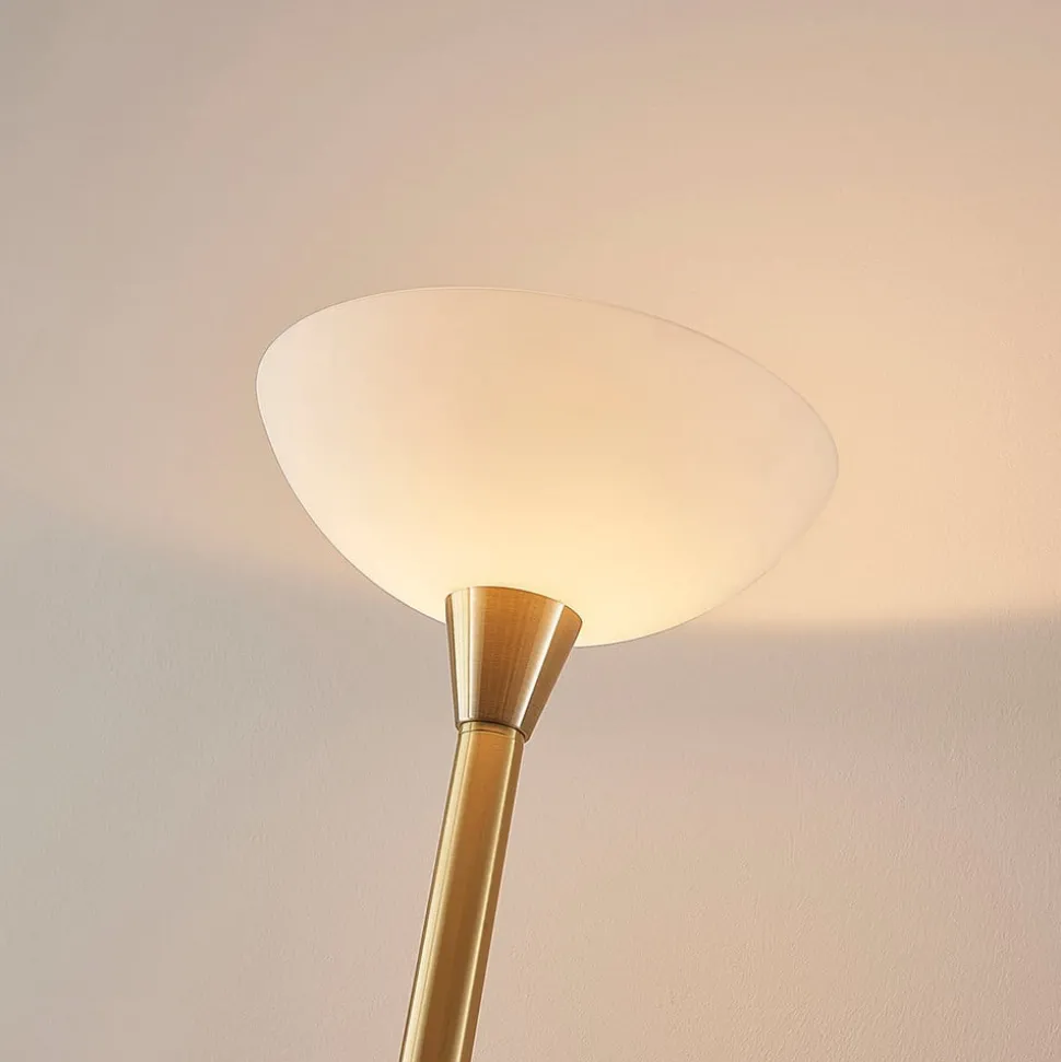 Ignacia ronde uplighter met een klassieke messing afwerking Ignacia heeft een glazen kap die aan de bovenkant open is en indirect licht uitstraalt. Dit zorgt voor een zeer gezellige verlichting van de woonkamer. Dit type verlichting is vooral welkom in gezellige avonden, wanneer de hoofdverlichting vaak als te fel en ongemakkelijk wordt ervaren. In principe lijkt de uplighter heel eenvoudig met zijn minimalistische vorm, maar het messingkleurige oppervlak geeft de vloerlamp een meer klassiek effect.
