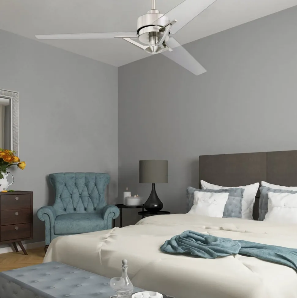 Het uiterlijk van de plafondventilator Julien maakt hem tot een echt designelement, ook als hij niet in gebruik is. De behuizing is afgewerkt met geborsteld nikkel en heeft een ultramodern design. De drie transparante vleugels passen moeiteloos in deze look en worden van onderaf extra ondersteund door filigrane steunen. Een bijpassende afstandsbediening is al bij de levering inbegrepen. De bijgeleverde tussenstang moet voor de montage worden gebruikt. Bijpassende verlengstangen zijn apart verkrijgbaar als accessoire.