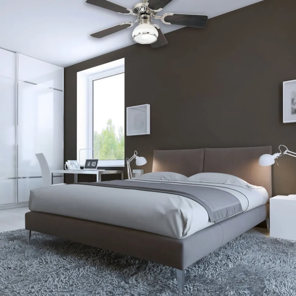 Exclusieve Princess Radiance II plafondventilator met een elegant ontwerp De exclusieve Princess Radiance II plafondventilator is vakkundig ontworpen. Met zijn innovatieve lamp zorgt de geïntegreerde lamp ook voor een aangenaam licht in de kamer. De lamp van gebogen glas vormt een esthetische combinatie van hoogwaardige materialen met de artistiek vormgegeven chromen rand. De lampen en een afstandsbediening kunnen als accessoires worden aangeschaft. Functies Deze plafondventilator heeft een vooruit- en achteruitstand die kan worden gevarieerd met een schakelaar die in de behuizing is ingebouwd. Op deze manier wordt de lucht in de zomer optimaal gekoeld en in de winter wordt de lucht door de bladen gelijkmatig in de kamer verdeeld. Het vermogen en de snelheid worden elk in drie stappen geregeld. De ventilator kan worden geïnstalleerd met of zonder de meegeleverde plafondstang. De bladen zijn aan één kant zwart en aan de andere kant wit gelakt, zodat ze tijdens de installatie in de gewenste kleur kunnen worden gedraaid. Technische gegevens Vermogen per snelheid: – 33,8 watt bij 125 tpm – 36,2 watt bij 175 tpm – 43,5 watt bij 235 tpm