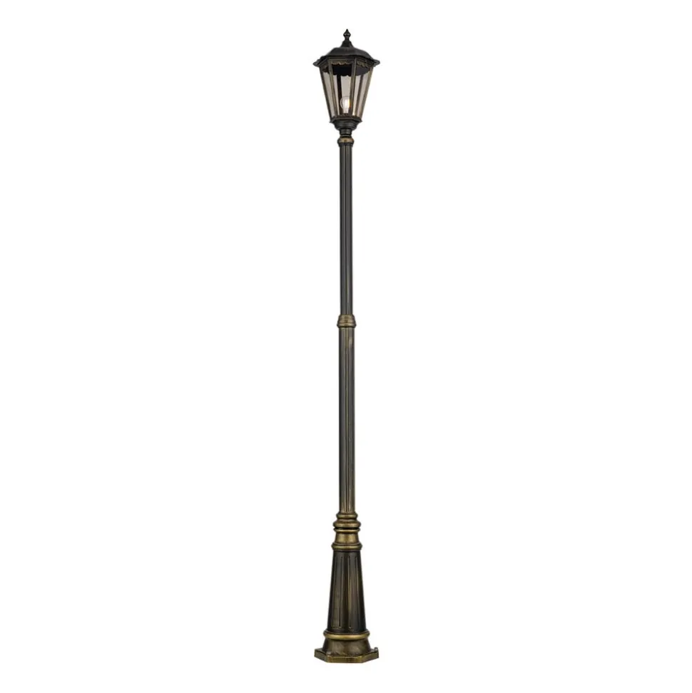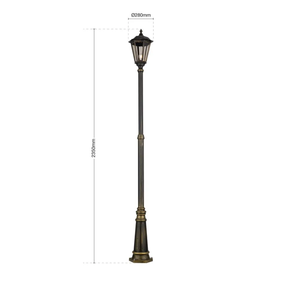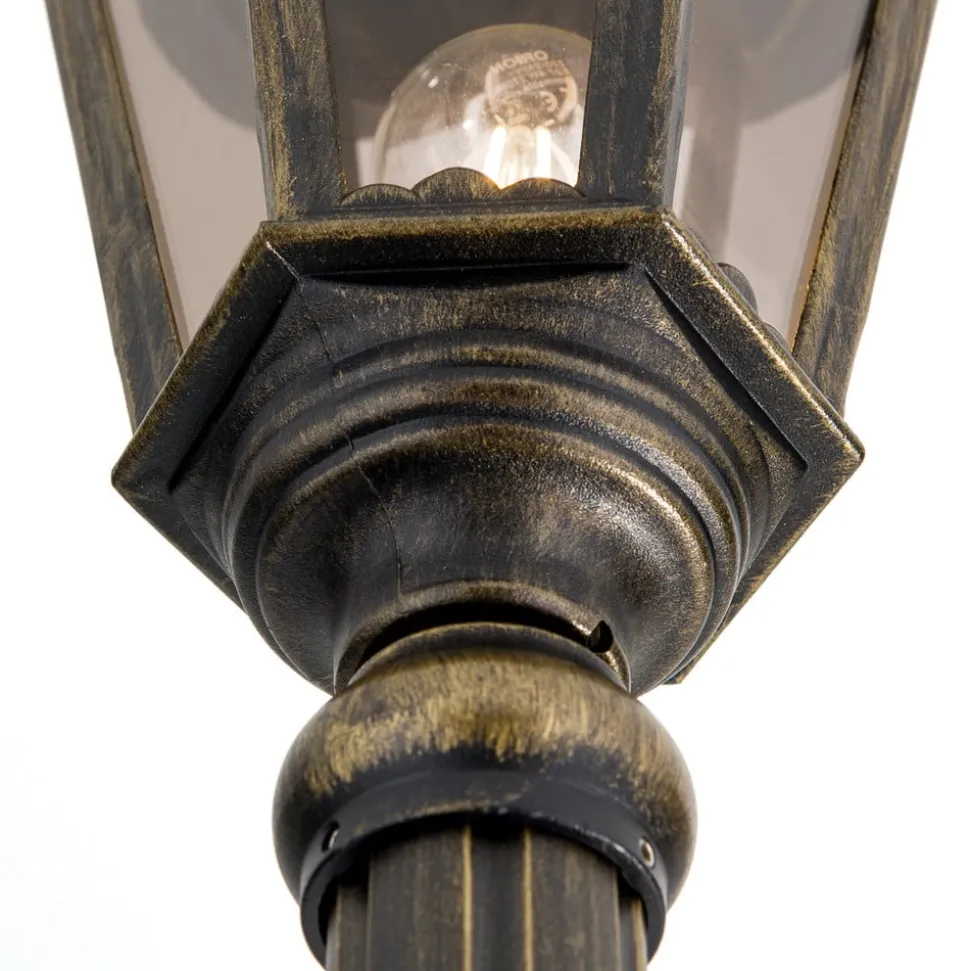 De verlichting uit de Puchberg-serie zorgt voor een veilige nachtverlichting en biedt overdag een aantrekkelijk uiterlijk: de armatuur glanst in zwart-goud terwijl de vensterglazen in de lampkop in zacht rookgrijs zijn uitgevoerd.