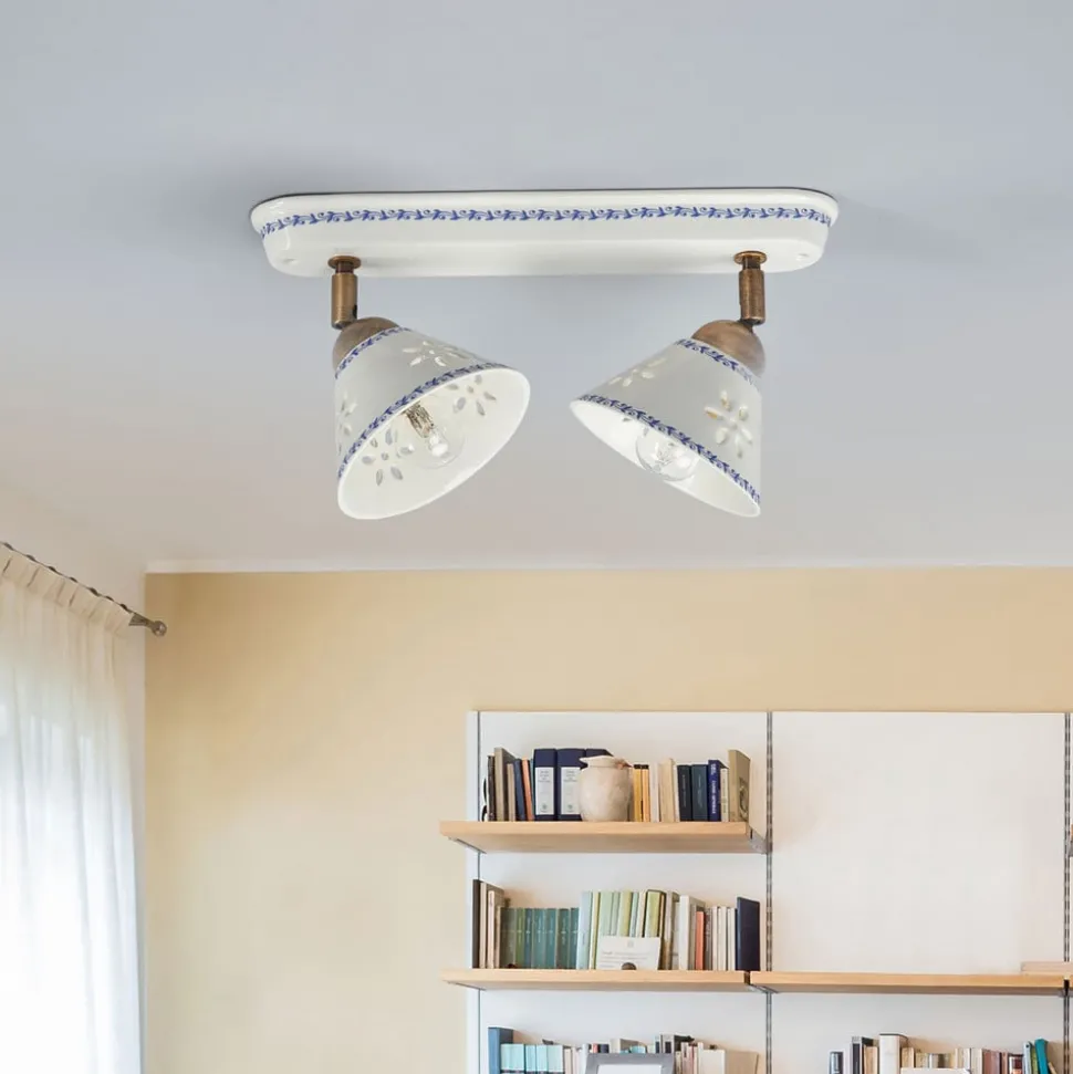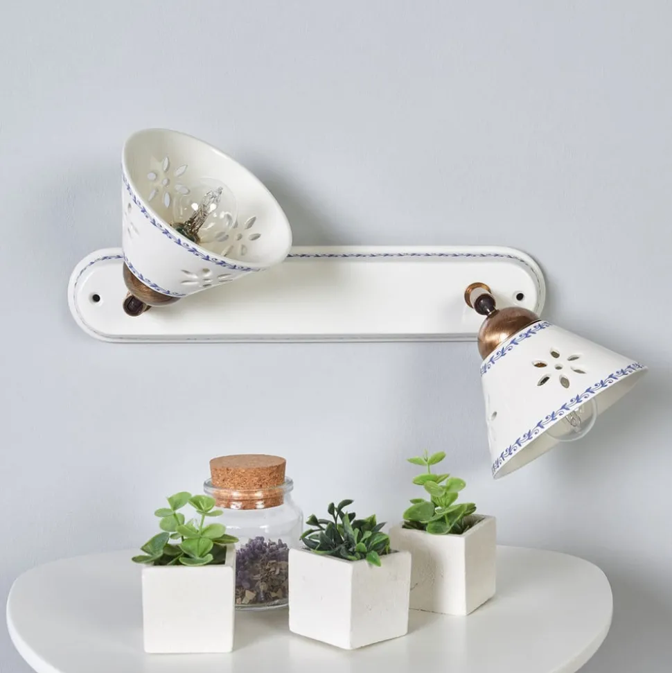 Wandlamp NONNA: moderniteit in een traditioneel jasje De wandlamp NONNA verenigt traditie en moderniteit door de combinatie van keramiek en metaal. De kappen en de wandrail zijn gemaakt van wit keramiek met een blauwe decoratieve band, terwijl de houders van de kappen van metaal zijn. Beide lampenkappen zijn versierd met een geperforeerd patroon in de vorm van bloemen. Romantische verlichting voor gezellige uurtjes Met 2 x 40 watt aan vermogen creëert de wandlamp een sfeervol licht dat uitnodigt om te ontspannen. Kamers in een landhuisstijl worden perfect aangevuld door de charmante, nostalgische wandlamp. Zo krijgt zelfs een gewone gang een warme en gezellige sfeer die zowel bewoners als gasten verwelkomt.