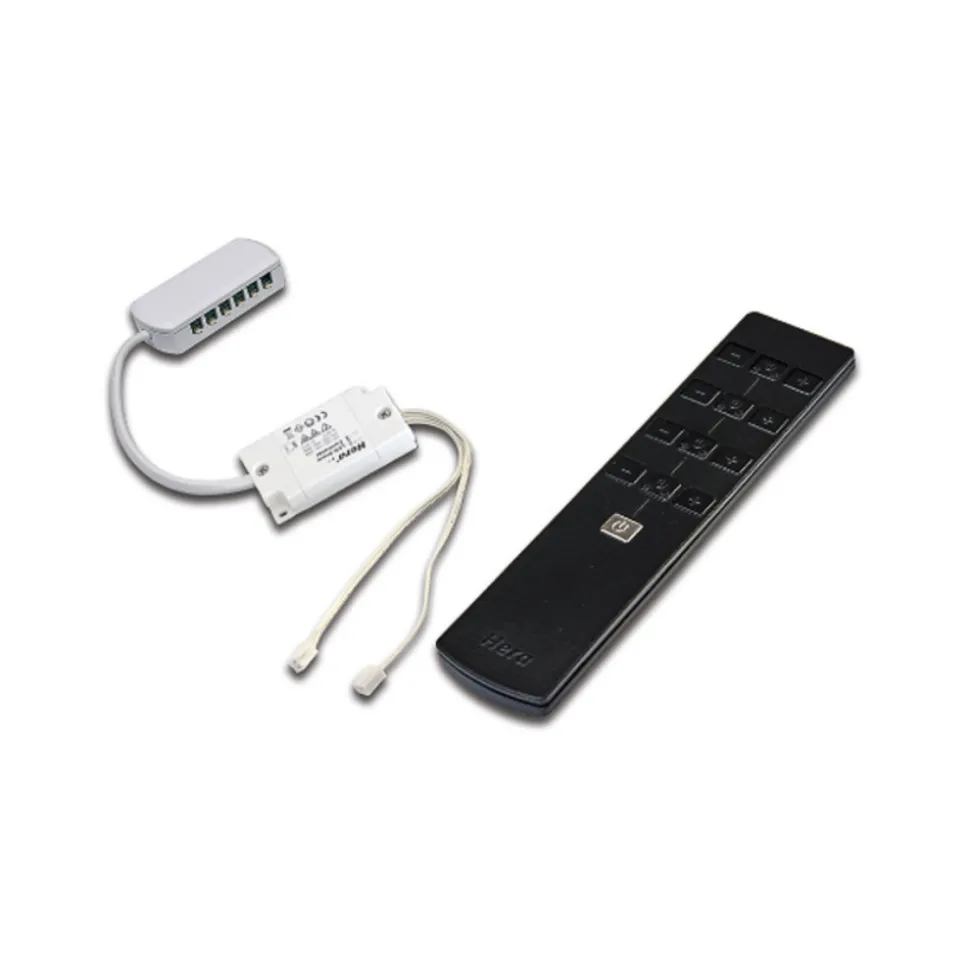 24V dimcontroller radio 80 W met 12-voudige verdeler en 4-kanaals radiografische afstandsbediening De insteekbare transformator met radiografische afstandsbediening voor dimmen en schakelen met een reikwijdte tot 15 m is voorzien van een memoryfunctie, zodat de vorige dimtoestand weer wordt hersteld als de netspanning wordt uitgeschakeld.