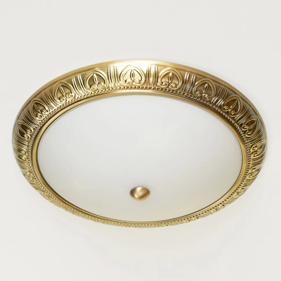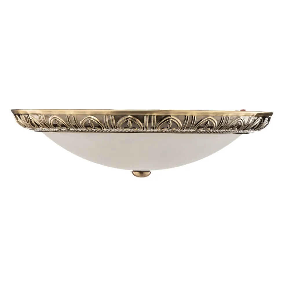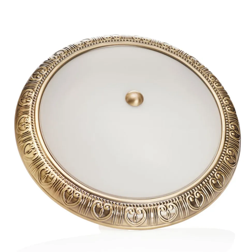 Lembit plafondlamp, rond, diameter 38 cm De plafondlamp uit de Lembit-serie is rond en heeft een diameter van 38 cm. Voor deze lamp zijn hoogwaardige materialen en uitstekend vakmanschap gebruikt. Het witte opaalglas is gevat in een sierlijke fitting van antiek messing. Drie lampen van 40 watt zorgen voor voldoende lichtopbrengst.