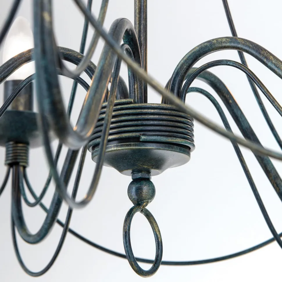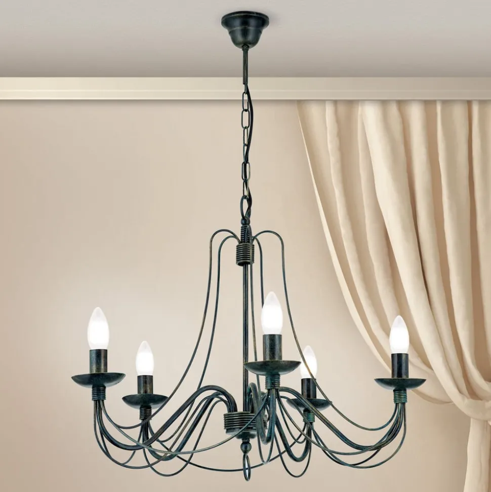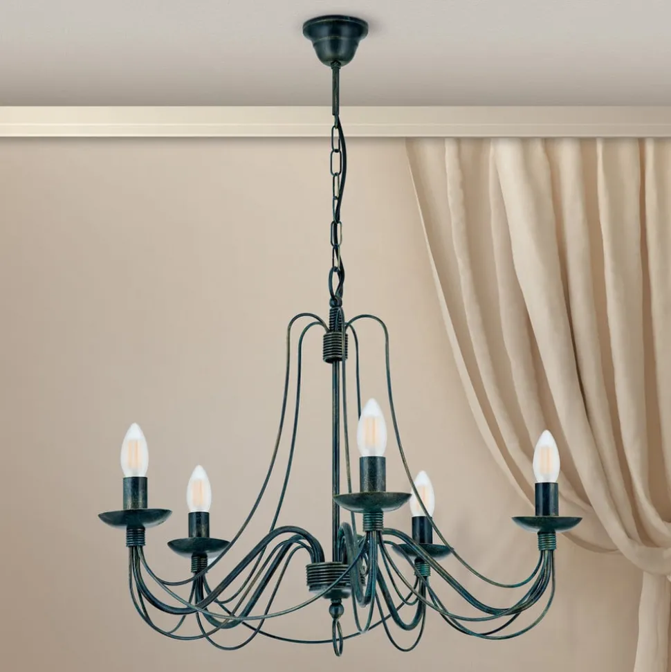 Vijf-lichts kroonluchter Vela met nostalgische landhuisflairDe vijf-lichts kroonluchter Vela straalt met zijn met de hand gepatineerde oppervlak een nostalgische en tegelijkertijd elegante charme uit. Het metalen frame toont op indrukwekkende wijze het filigraanwerk dat mogelijk is in de kunst van het smeden. Zo zien de vijf kaarsen eruit alsof ze aan zwevende touwen zijn bevestigd en zorgen ze voor een heldere en feestelijke verlichting van de kamer.