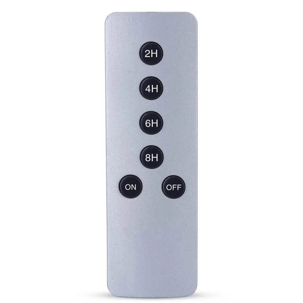 Afstandsbediening met zes functies Die afstandsbediening is gemaakt van matgrijs aluminium. Er kunnen zes functies worden geselecteerd: werking gedurende 2, 4, 6 of 8 uur, aan en uit. Voor de bediening is een knoopcel nodig: 1 x CR2032. Die batterij wordt niet meegeleverd, maar kan apart worden besteld via de accessoires.