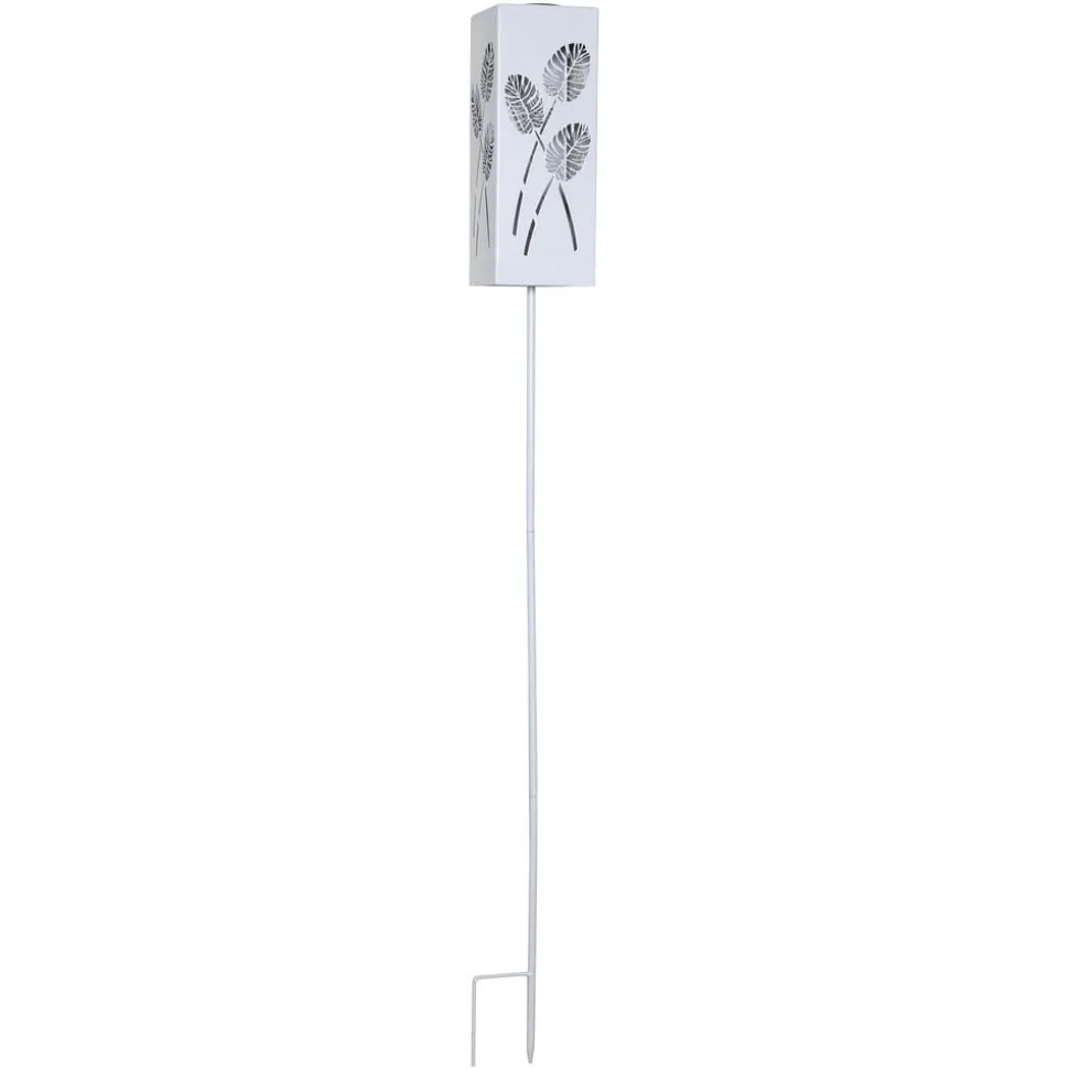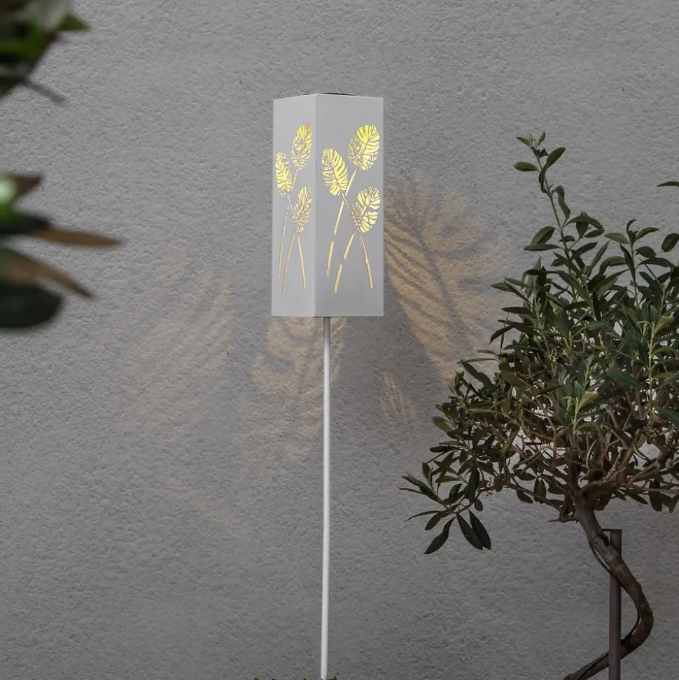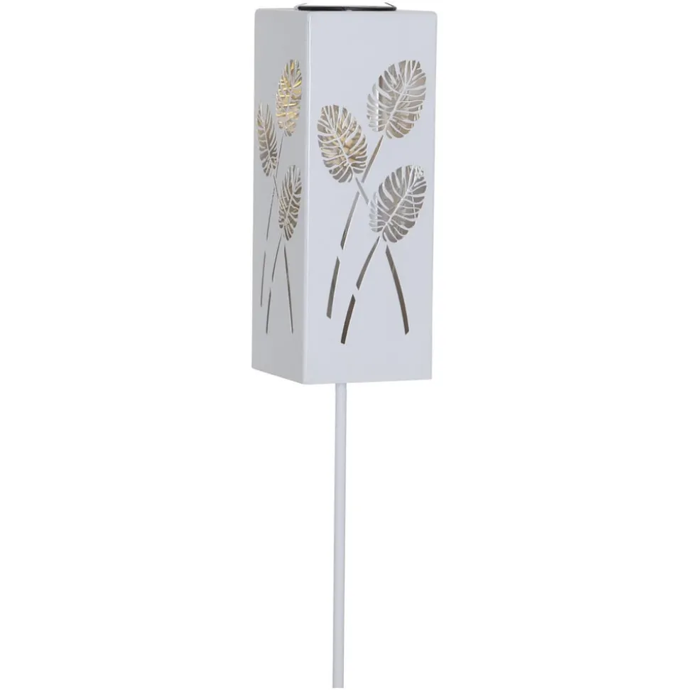 Veelzijdige Albaleaf LED lamp op zonne-energie met geperforeerd patroon De Albaleaf LED lamp op zonne-energie van wit metaal heeft een aantrekkelijk geperforeerd patroon in de vorm van bladeren. Het licht spot door dit patroon naar buiten en creëert sfeervolle lichteffecten. Dankzij de praktische 2-in-1 functie kan de lamp op zonne-energie gebruikt worden als tafellamp of als tuinpadverlichting met behulp van de grondspies. Je kunt ook kiezen tussen twee hoogtes. Dit maakt Albaleaf zeer flexibel in gebruik, wat nog wordt versterkt door de oplaadbare batterij. Deze wordt overdag opgeladen met zonne-energie – Inclusief schemersensor – Lichtduur ca. 8 uur – Kan worden gebruikt als tafellamp (25 cm) of tuinpadverlichting (75 of 90 cm)