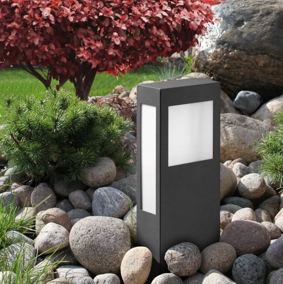 Robuuste sokkellamp Aqua Paulo met Makrolon ruiten De sokkellamp Aqua Paulo met Makrolon ruiten is robuust en slagvast. De antracietkleurige behuizing in een verticale kubusvorm met vier ruiten van opaalglas zorgt voor een aangename verlichting rondom in de ruimte. Een bijzonder voordeel van de sokkellamp zijn de flexibele installatiemogelijkheden. Ze kan worden vastgeschroefd op betonnen funderingen of stenen vloeren. Hij kan ook in de grond worden bevestigd met een grondspies. De grondspies is verkrijgbaar in de accessoires. De lamp is afkomstig van een Duitse fabrikant en wordt geleverd met een warmwitte 7 W 2G11 LED lamp. Maximaal wattage voor de lamp: 18 watt.