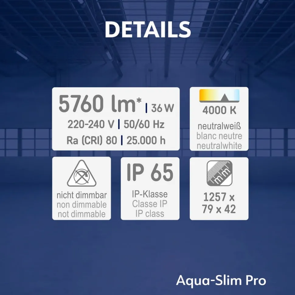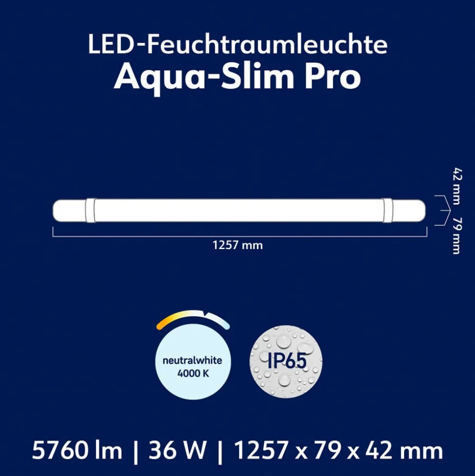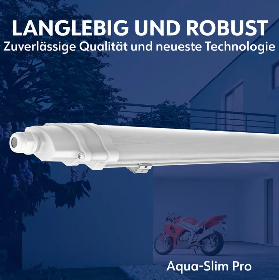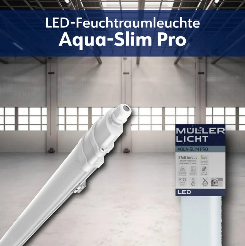 Aquaslim LED strooilamp met beschermingsgraad IP65 Ervaar een uitstekende helderheid met de Aqua-Slim Pro. Kelder of werkplaats – de vochtbestendige LED Aquaslim lamp van Müller-Licht met hoge lumenoutput is perfect voor grote ruimtes en werkgebieden die een gelijkmatige en krachtige verlichting nodig hebben. Dankzij IP65 is de LED vochtbestendige lamp perfect voor alle soorten vochtige ruimtes – Beschermingsgraad IP65, stofdicht en betrouwbare bescherming tegen waterstralen – Kan ook worden gebruikt in overdekte buitenruimtes – Uiterst eenvoudige installatie dankzij de innovatieve snelkoppeling met steekverbinding – Universeel wit licht voor optimale taakverlichting – Eenvoudig, plat ontwerp