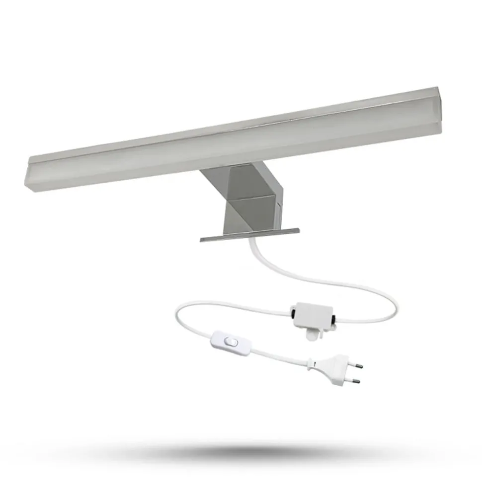 Moderne LED spiegellamp Birkos in chroomkleurige look Een betrouwbare spiegellamp is een must in de badkamer. Birkos is een LED lamp die op een spiegelkast kan worden bevestigd. Het heeft een strak, modern ontwerp en is gemaakt van aluminium en acryl. Er zit een tuimelschakelaar op het netsnoer waarmee je hem gemakkelijk aan en uit kunt zetten. De beschermingsgraad IP44 maakt het perfect voor gebruik in een badkamer.