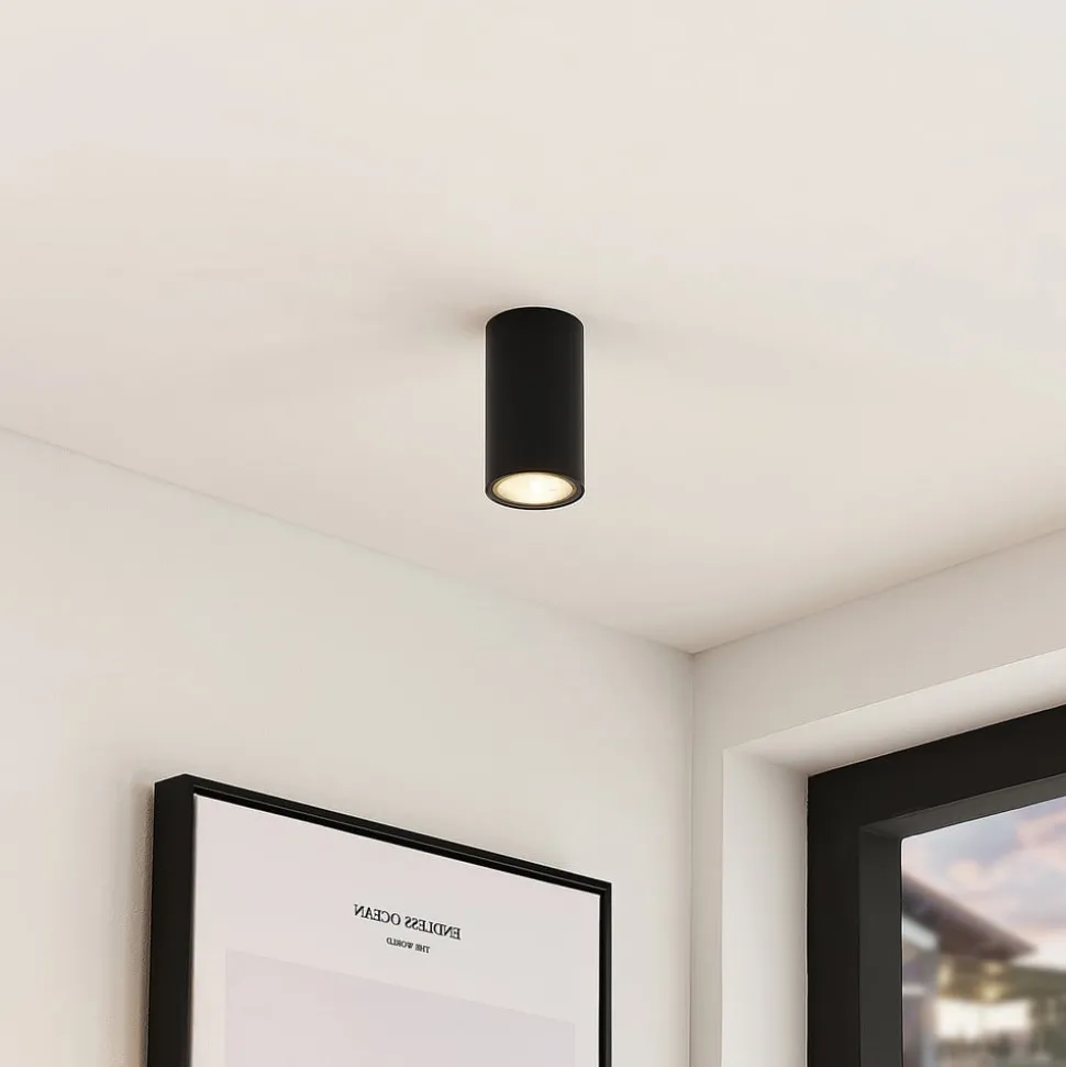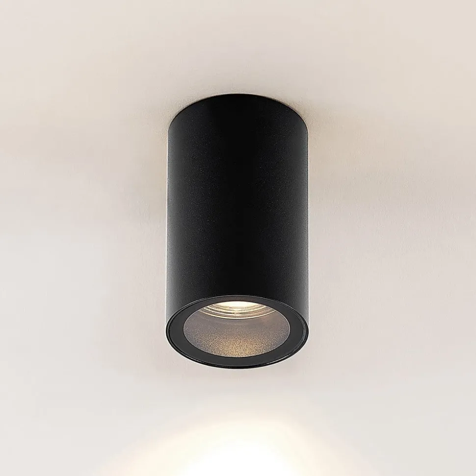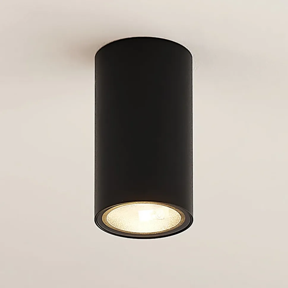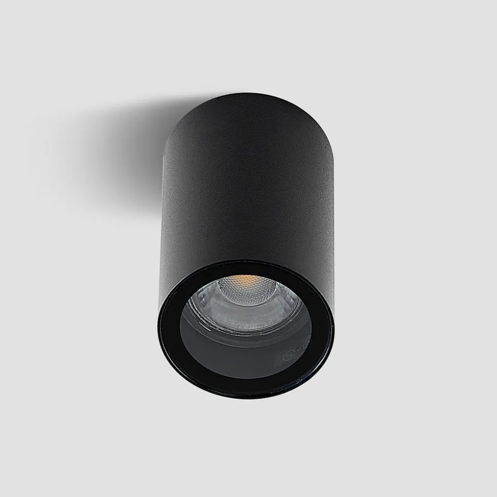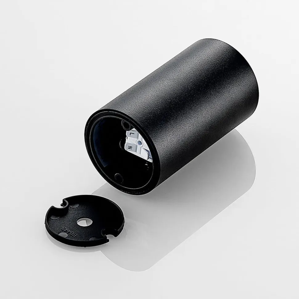 Cilindervormige GU10 downlight Olivir van matzwart gelakt aluminium, met extra reflectorlamp in goud Olivir heeft een matzwarte armatuurbehuizing van aluminium, die een eenvoudige ronde vorm heeft en op verschillende manieren kan worden gebruikt. De kap van de downlight ziet er dus heel modern uit, maar straalt ook iets tijdloos uit. Voor meer individualiteit op het gebied van lichtontwerp en uiterlijk is de downlight uitgerust met twee verwisselbare reflectorlampen, waarvan de ene net als de behuizing zwart is en de andere een gouden afwerking heeft voor een effectief contrast.