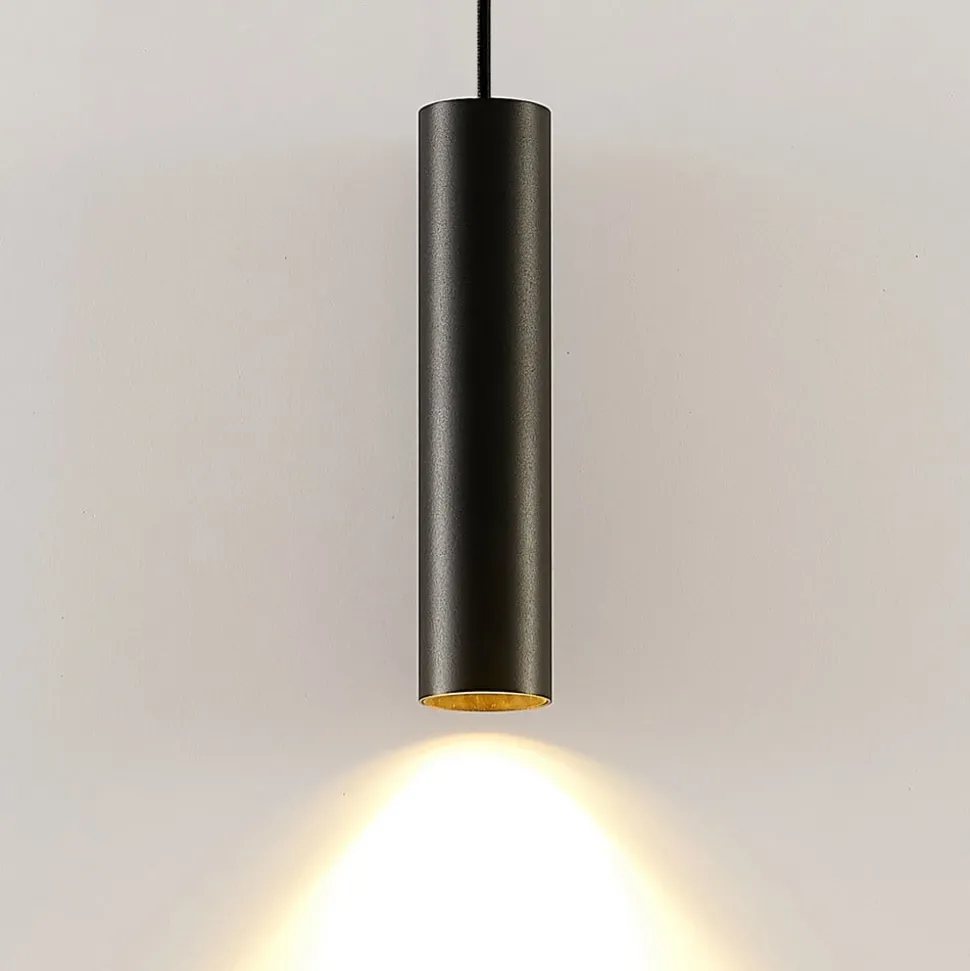 Smalle, zwarte hanglamp Ejona met twee verwisselbare reflectorlampen in zwart en goud De smalle vorm van Ejona maakt haar ideaal voor balieverlichting en kan ook met meerdere lampen op een rij worden geïnstalleerd. De kap is cilindervormig en gemaakt van aluminium met een matzwarte afwerking. Door de GU10 lamp te kiezen, kun je de stralingshoek van het licht bepalen, want er zijn lampen met een bredere en smallere bundel. Als speciaal element wordt de hanglamp geleverd met een extra reflectorlamp die goud getint is en daardoor het lichtpatroon beïnvloedt, dat dan gekenmerkt wordt door warmere reflecties. Het uiterlijk profiteert ook van het harmonieuze kleurcontrast.