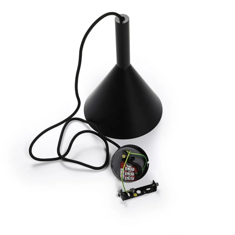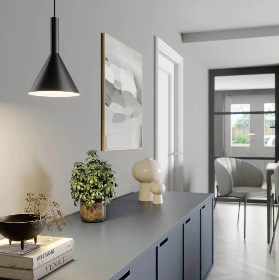Tadej past bijzonder goed bij moderne, puristisch aandoende woonstijlen. De hanglamp bestaat in feite uit een trechtervormige kap, die aan de bovenkant een langwerpig, smal element heeft en aan de onderkant uitmondt in een zich constant verbreedend kapelement. Op deze manier wordt ervoor gezorgd dat het licht uitsluitend naar beneden wordt gericht, want metaal is zoals bekend een lichtondoorlatend materiaal en alleen waar de kap open is, dus aan de onderkant, kan het licht van de E27 lamp ontsnappen. Deze lamp kan naar keuze worden gekozen en kan ook worden voorzien van efficiënte LED-technologie of een extra warme lichtkleur hebben. De hanglamp met de zwarte buitenkant kan als solitair worden gebruikt voor algemene ruimteverlichting, maar kan ook stijlvol in een rij met meerdere exemplaren van hetzelfde type boven een tafel of balie worden geplaatst.