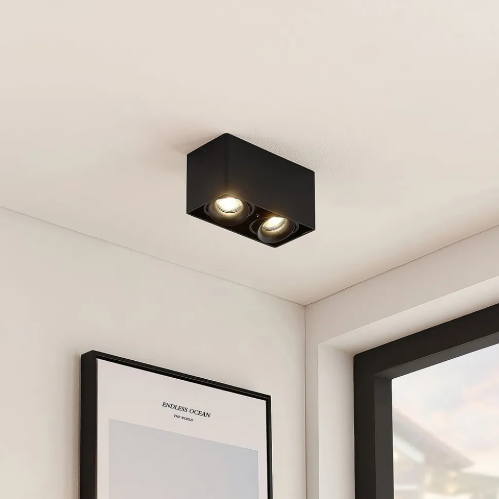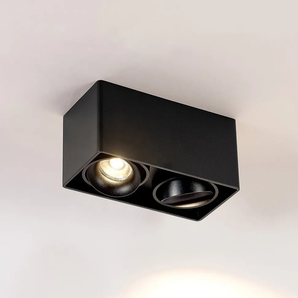 2-lamps plafondlamp Kubika van aluminium De rechthoekige plafondlamp Kubika van aluminium maakt indruk met haar minimalistische design en klassieke kleurkeuze. De behuizing is gemaakt van aluminium en heeft een zwarte afwerking. Er passen twee GU10 fittingen in die geschikt zijn voor bijpassende reflectorlampen. Met een directe neerwaartse bundelrichting zorgen de reflectorlampen voor een gelijkmatige en niet-verblindende lichtverdeling. Dit armatuur is ideaal in combinatie met andere lichtbronnen uit dezelfde serie – niet alleen in particuliere woonruimtes, maar ook in de horeca.