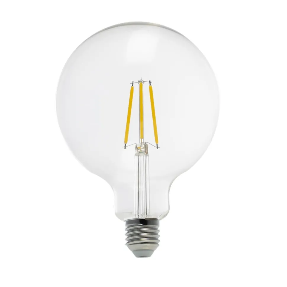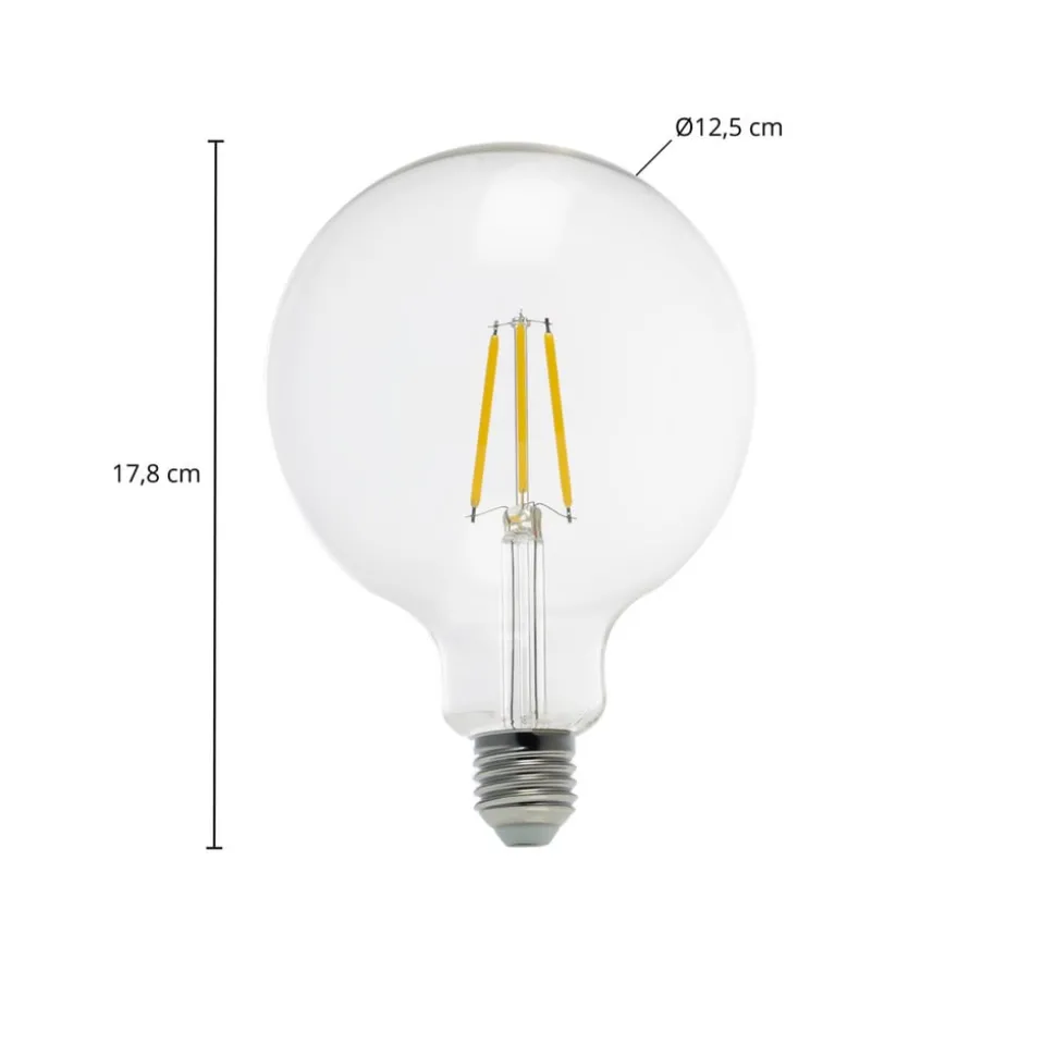 G125 LED filament globe lamp E27 3,8 W 2.700 K, EEK ATDeze LED filament lamp heeft globe vorm afmetingen G125 en is daarom groter dan normale lampen. Dit maakt het bijzonder geschikt voor open armaturen, die dan visueel kunnen worden aangevuld met een lichtbron. De lamp heeft de bijzonder goede energie-efficiëntieklasse A en verbruikt dus slechts weinig elektriciteit in verhouding tot haar lichtsterkte. Technische gegevens:- warm wit (2.700 Kelvin)- bolvorm G125- EEK A