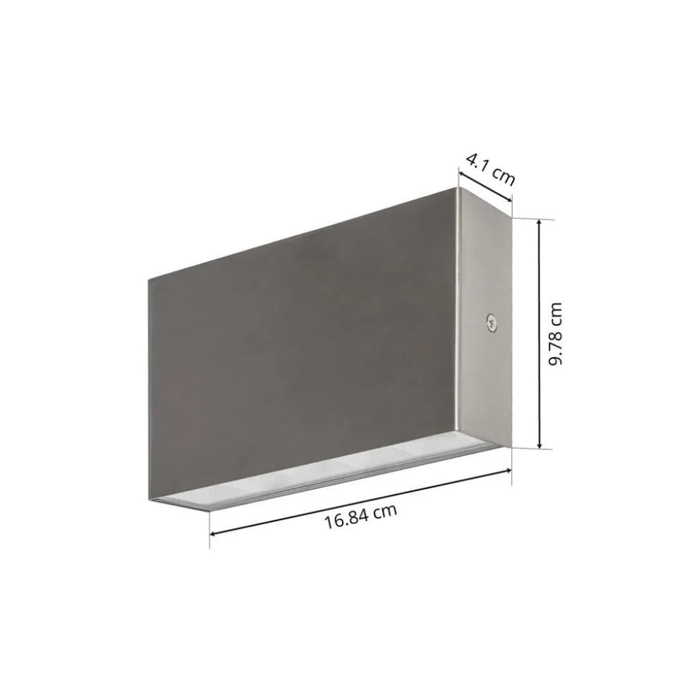 Karline hoekige LED wandlamp van V4A roestvrij staal, spot naar boven en beneden De Karline LED wandlamp is de perfecte metgezel als het gaat om het verlichten van een oprit, terras of entree. Ze is gemaakt van roestvrij staal en heeft de grijze kleur die typisch is voor dit materiaal. De vast geïnstalleerde LED’s genereren warmwit licht en spotten zowel de boven- als de onderkant van de armatuur, waardoor een fantastisch effect op de gevel ontstaat. De beschermingsgraad IP65 maakt Karline aantoonbaar stofdicht en beschermd tegen waterstralen en robuust voor elke buitenruimte. Indien gewenst kan het gecombineerd worden met andere lampen uit de serie om een harmonieuze totaalindruk te creëren.
