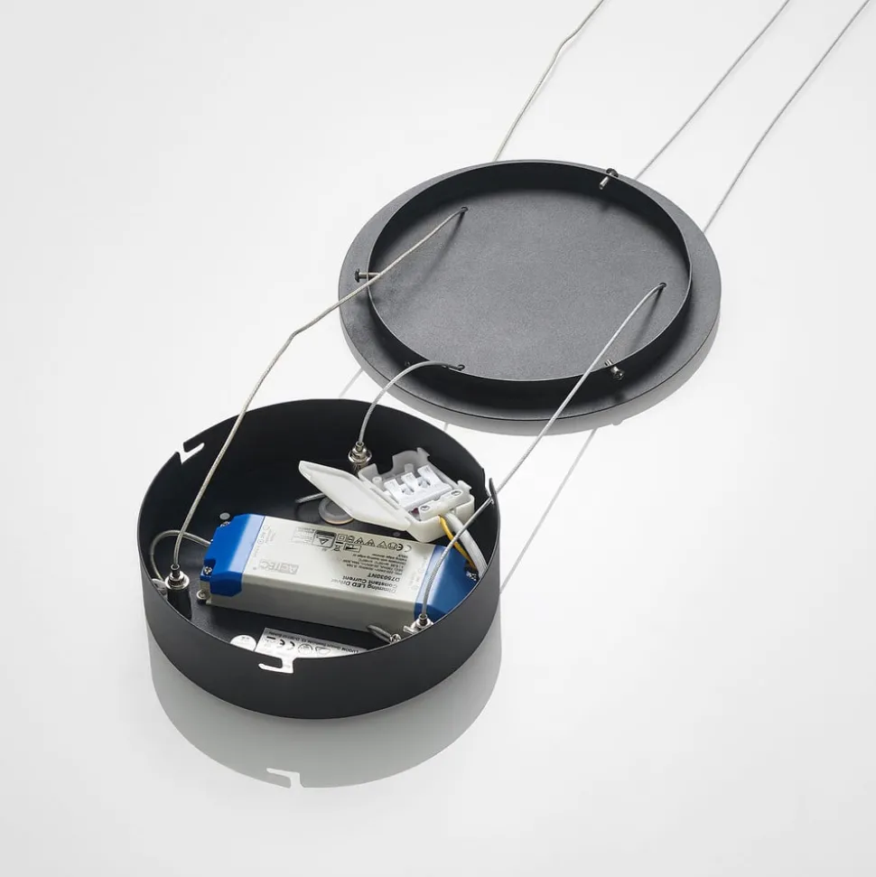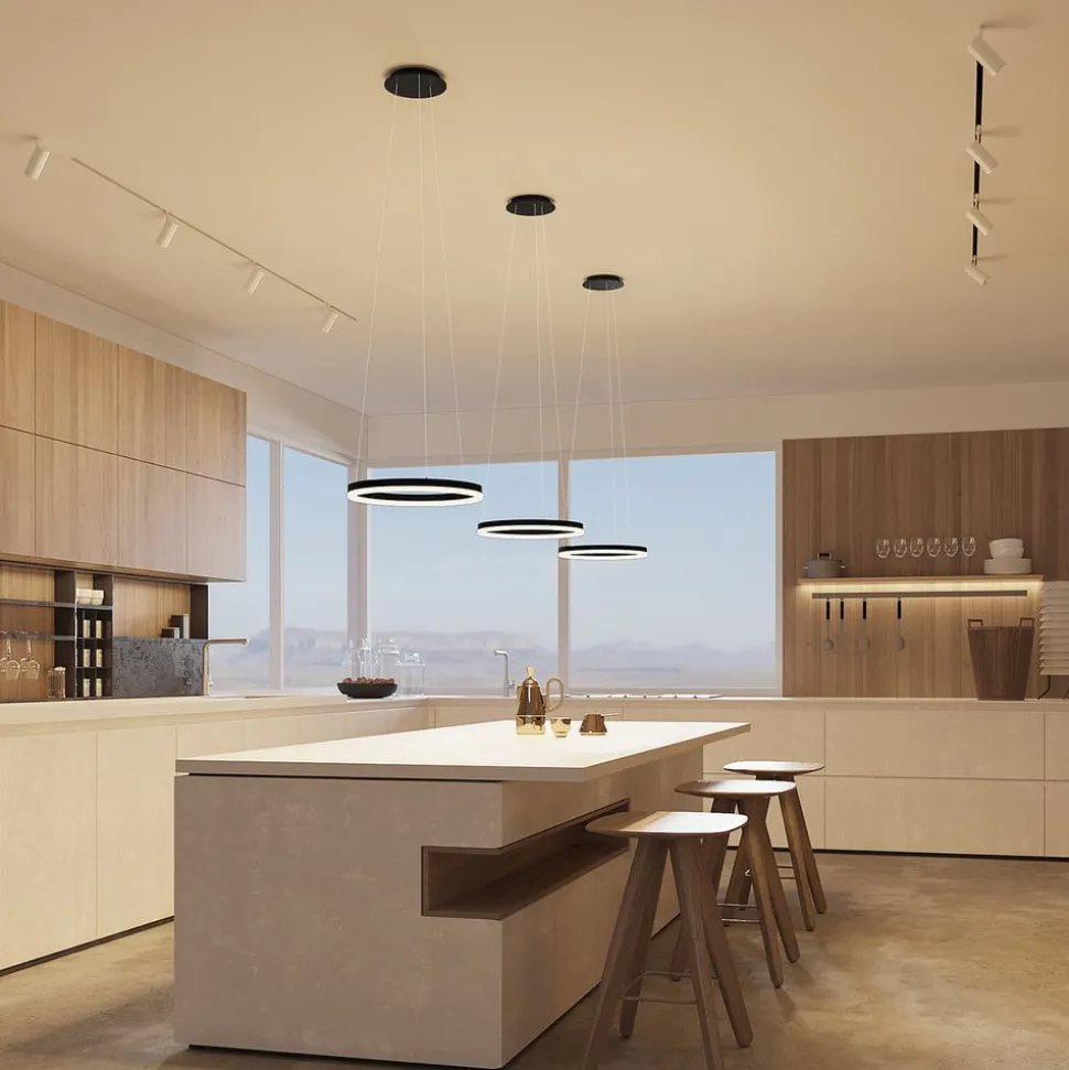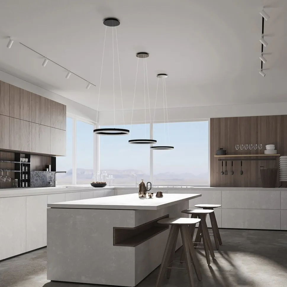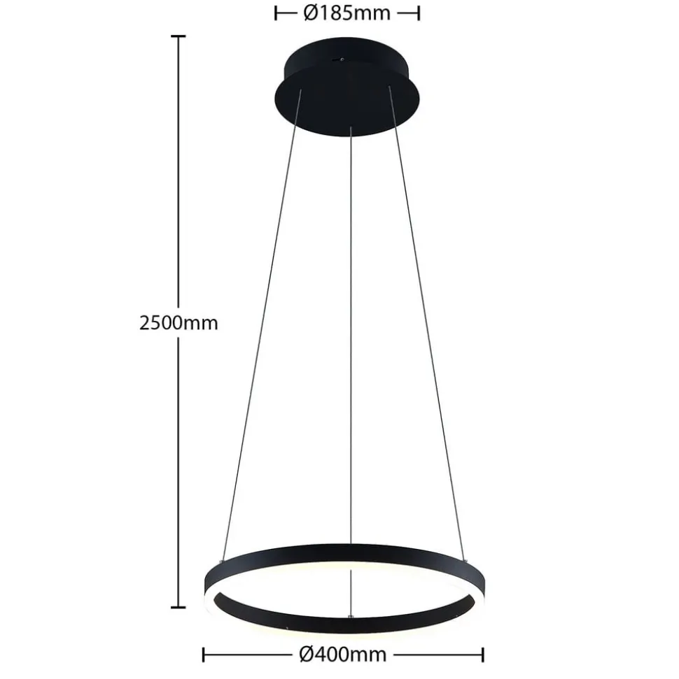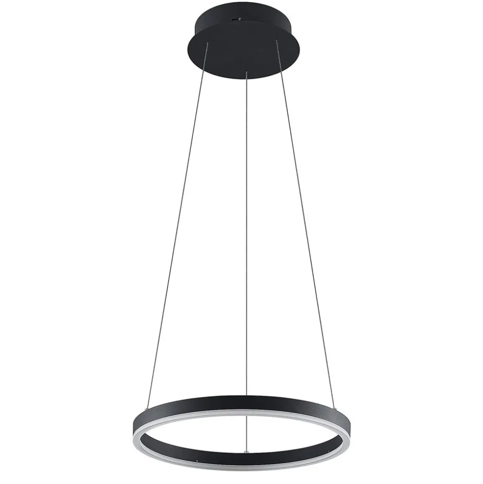 Albiona ringvormige LED hanglamp in zwart – perfect voor keukens en eetkamers Albiona is een lichtbron die met haar eigentijdse, minimalistische ringvorm bijzonder stijlvol oogt in moderne interieurs. De hanglamp reikt tot in de kamer aan drie filigraandraadkabels en wordt visueel gedomineerd door de zwarte metalen ring, aan de onderkant waarvan de heldere, efficiënte LED’s zijn ingebed die zorgen voor een warmwit, gezellig schijnsel. Stijlvol ontwerp met een speciale uitdrukking!