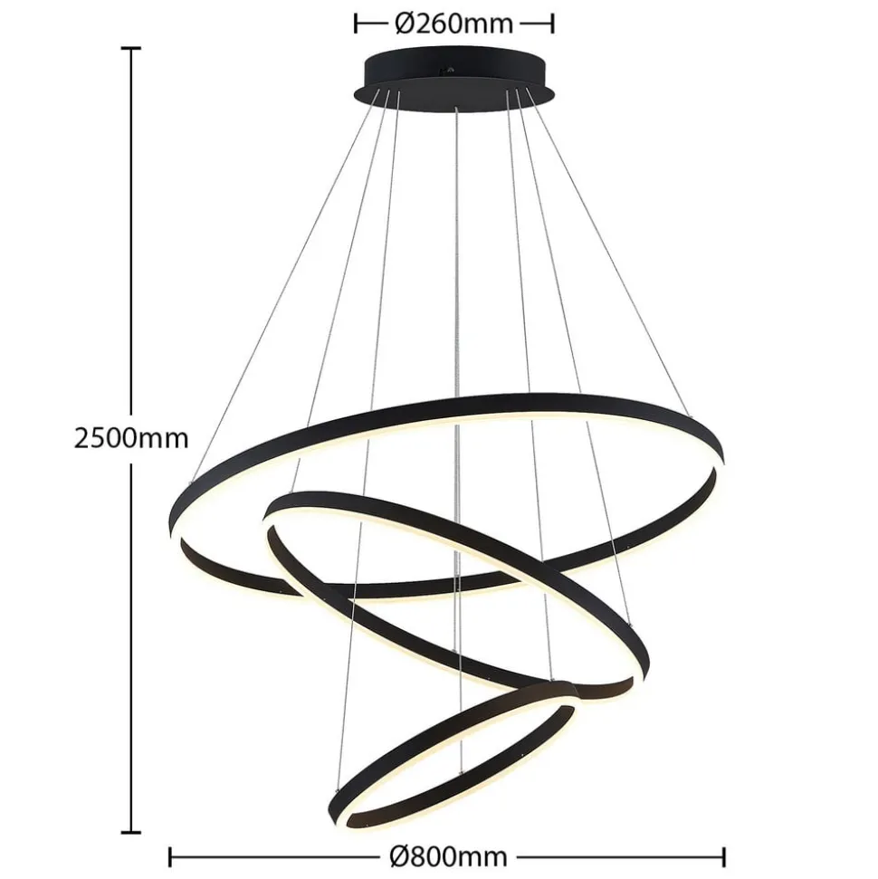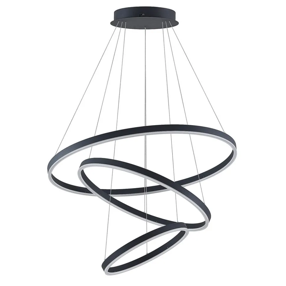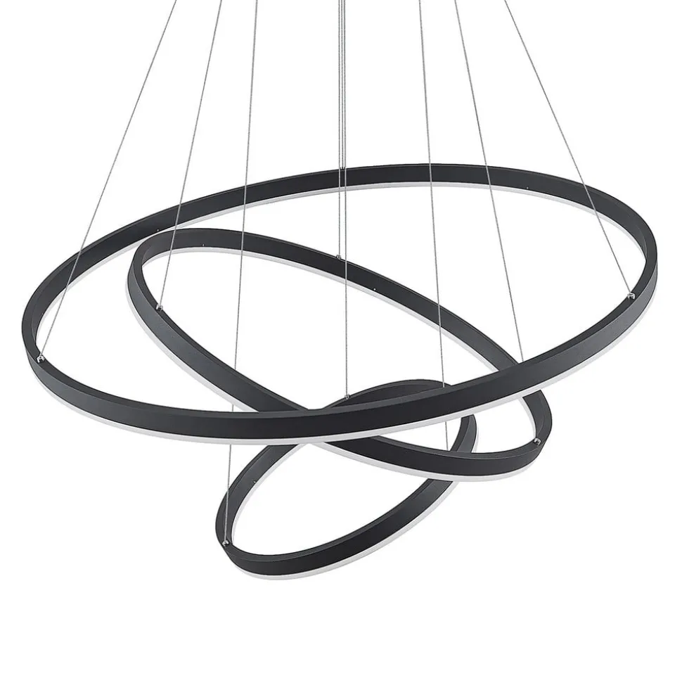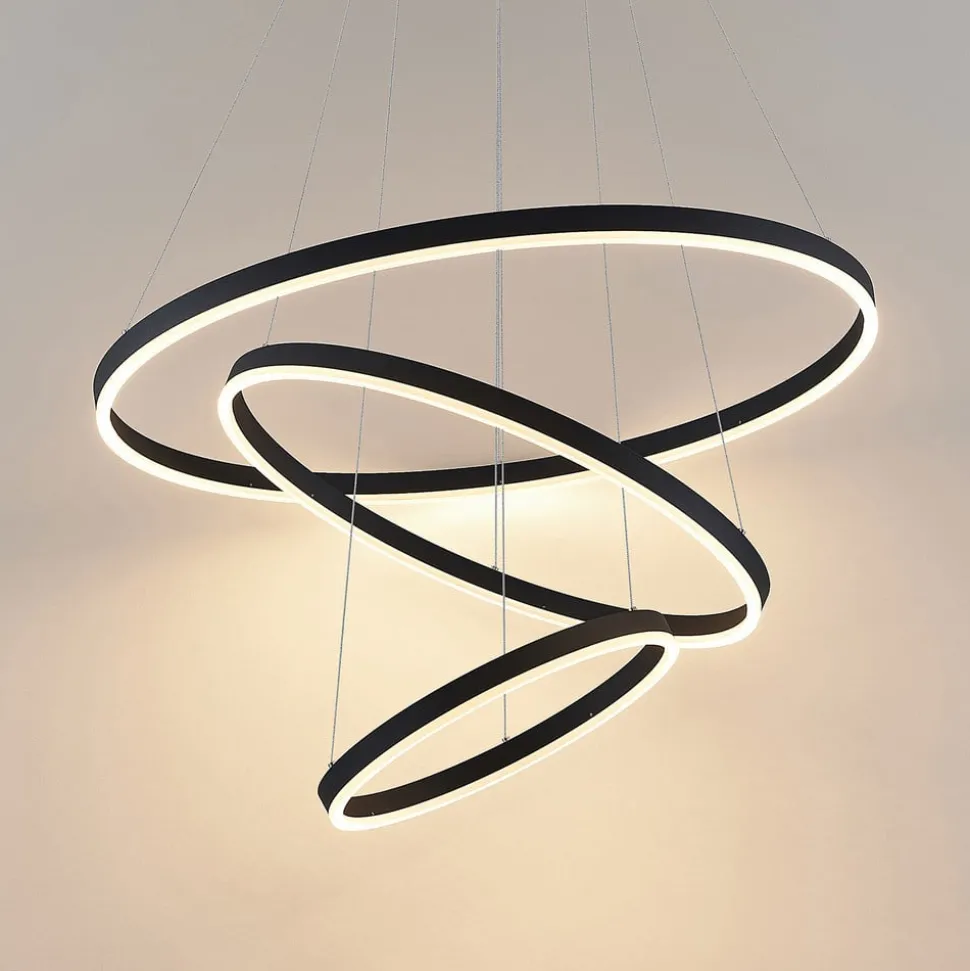 Ronde, 3-lamps Albiona LED hanglamp voor moderne eethoeken Albiona maakt indruk met haar trendy minimalistische ontwerp en is een hanglamp bestaande uit drie aluminium ringen van verschillende grootte die in een hoek hangen. Warmwitte LED’s schijnen helder aan de onderkant van de ringen en voorzien de kamer of eettafel van goede sfeerverlichting. Het zwarte oppervlak ziet er opvallend en modern uit en straalt een koele elegantie uit. De LED hanglamp Albiona maakt ook indruk door de hoogwaardige afwerking en is een zeer stijlvolle lichtbron voor eigentijdse woon- en eetruimtes.