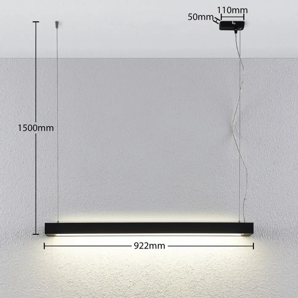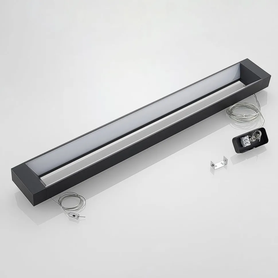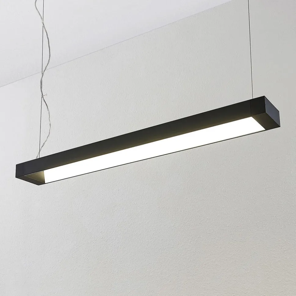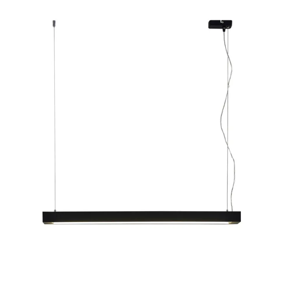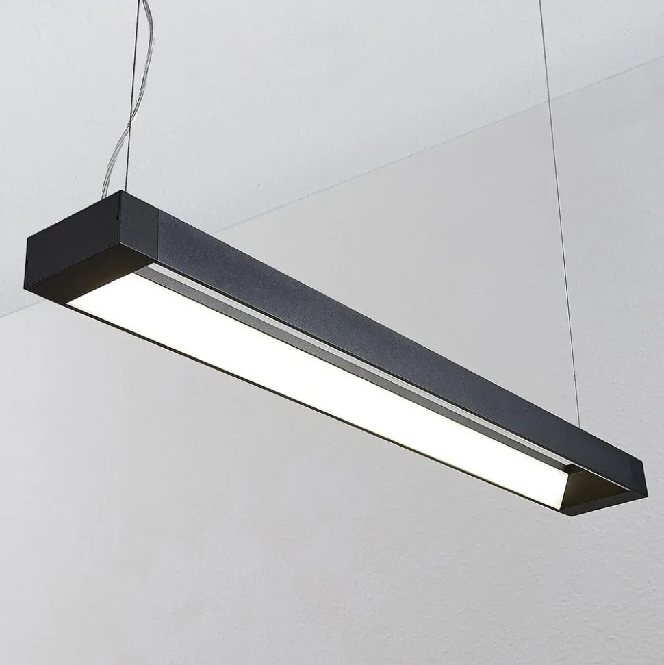 Cuna LED kantoor hanglamp in rechthoekige vorm en met zwart oppervlak Deze hanglamp met helder verlichte, energiezuinige LED’s is ideaal voor het verlichten van een ruimte. Dankzij het universeel witte licht kun je je lange tijd op je werk concentreren. Het frame van de kap heeft een hoekige vorm en is gemaakt van aluminium met een zwart oppervlak dat er zeer tijdloos uitziet. De stralingshoek van het licht is 120°. Technische gegevens: – Stralingshoek 120° – Universeel wit licht – Slagvastheid IK03 – SDCM < 5 – Doorvoerbedrading mogelijk