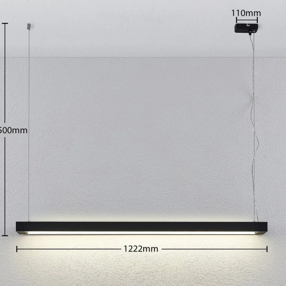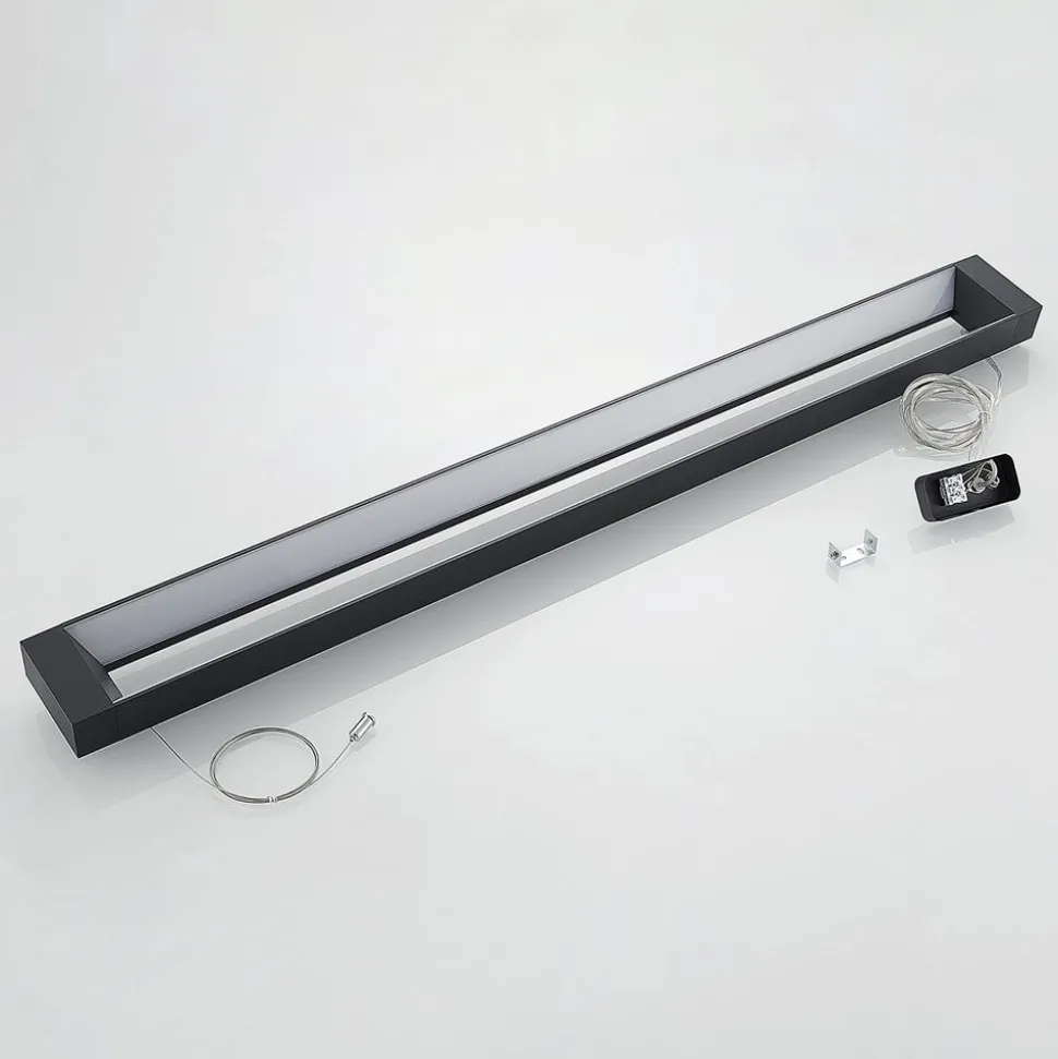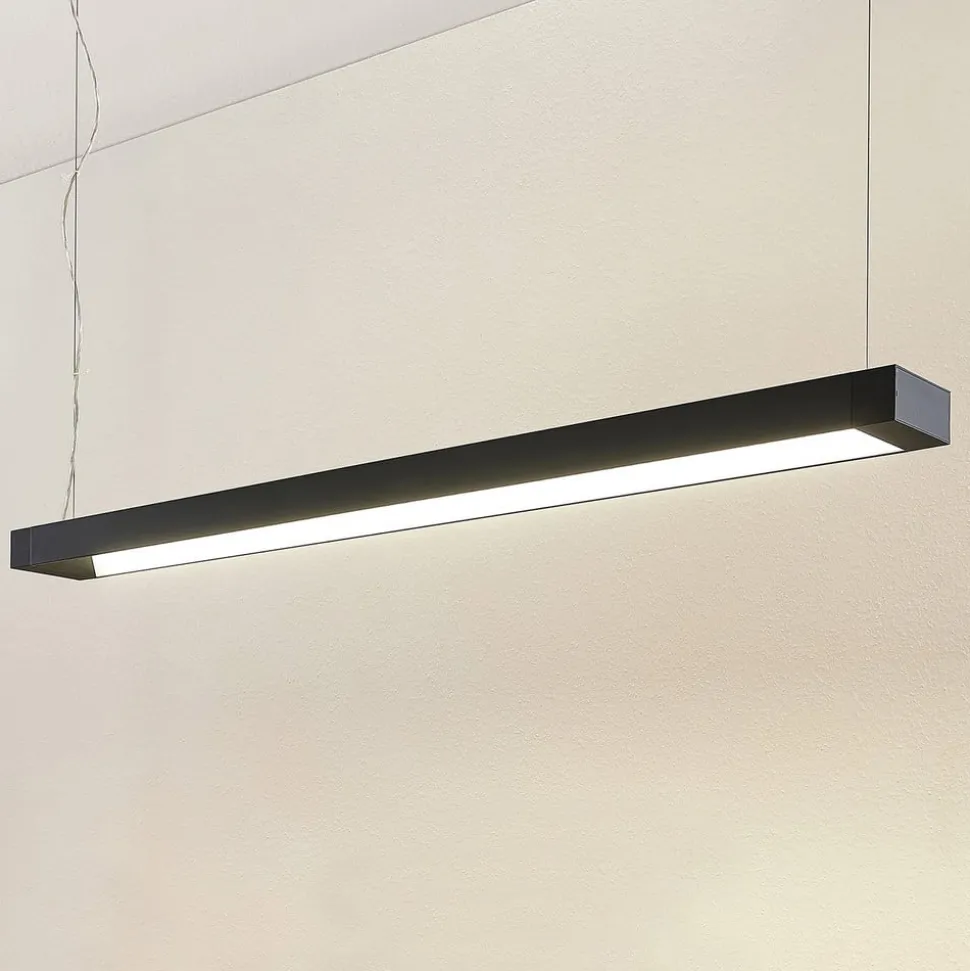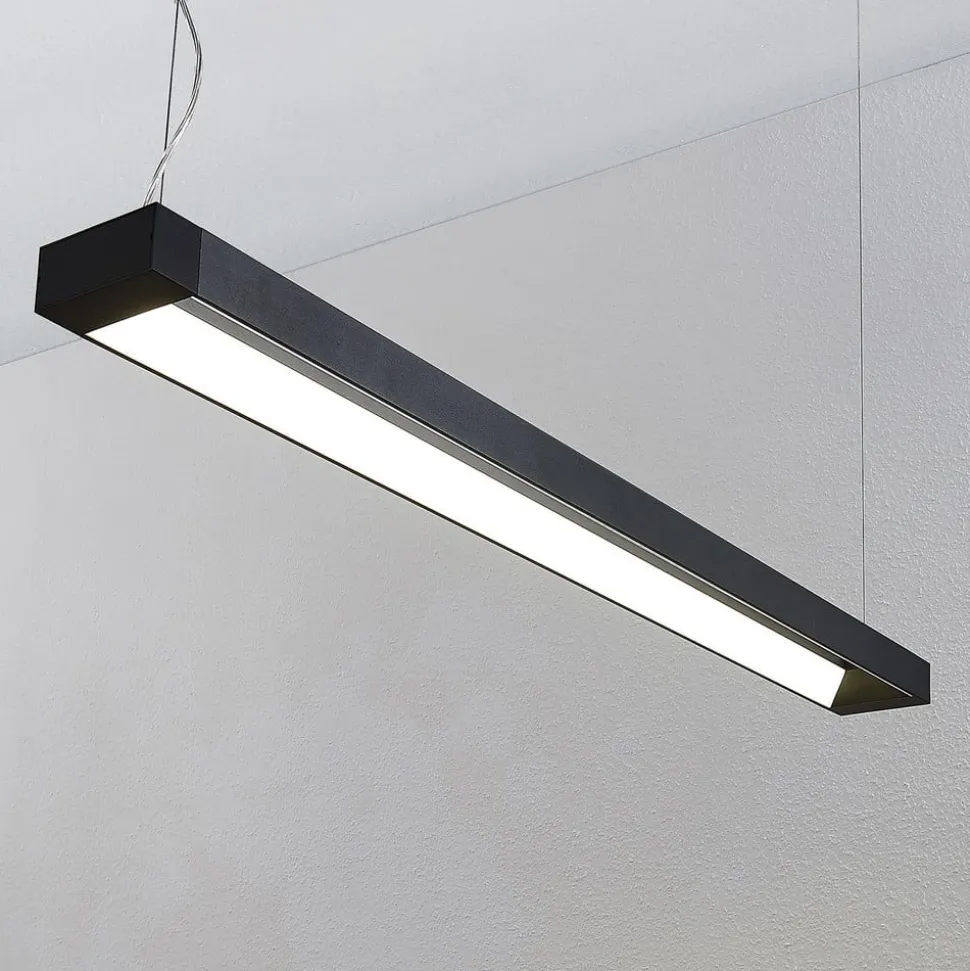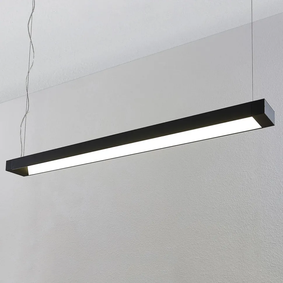 LED kantoor hanglamp Cuna met zwart oppervlak en rechthoekige vorm Cuna is een LED kantoor hanglamp die helder licht produceert en werkplekken goed verlicht. De lichtkleur is universeel wit, wat bijzonder aangenaam is voor de ogen tijdens het werken en vermoeidheid vermindert. Het langwerpige frame van de armatuur is zwart gelakt en heeft een hoekige vorm. Het licht van de LED’s wordt uitgestraald onder een hoek van 120°. Technische gegevens: – 120° stralingshoek – universeel wit lichtkleur – slagvastheid IK03 – SDCM < 5 – doorlusmogelijkheid