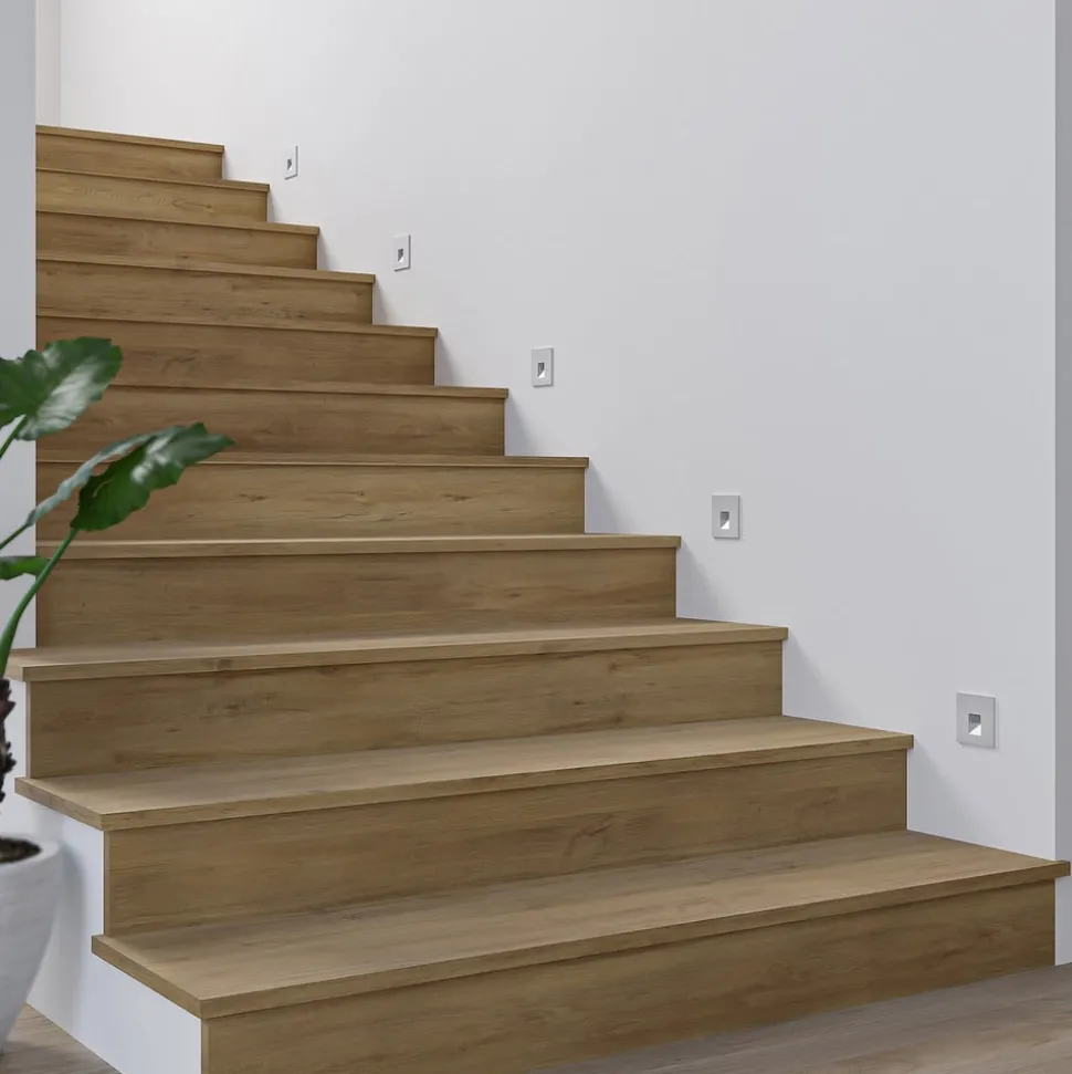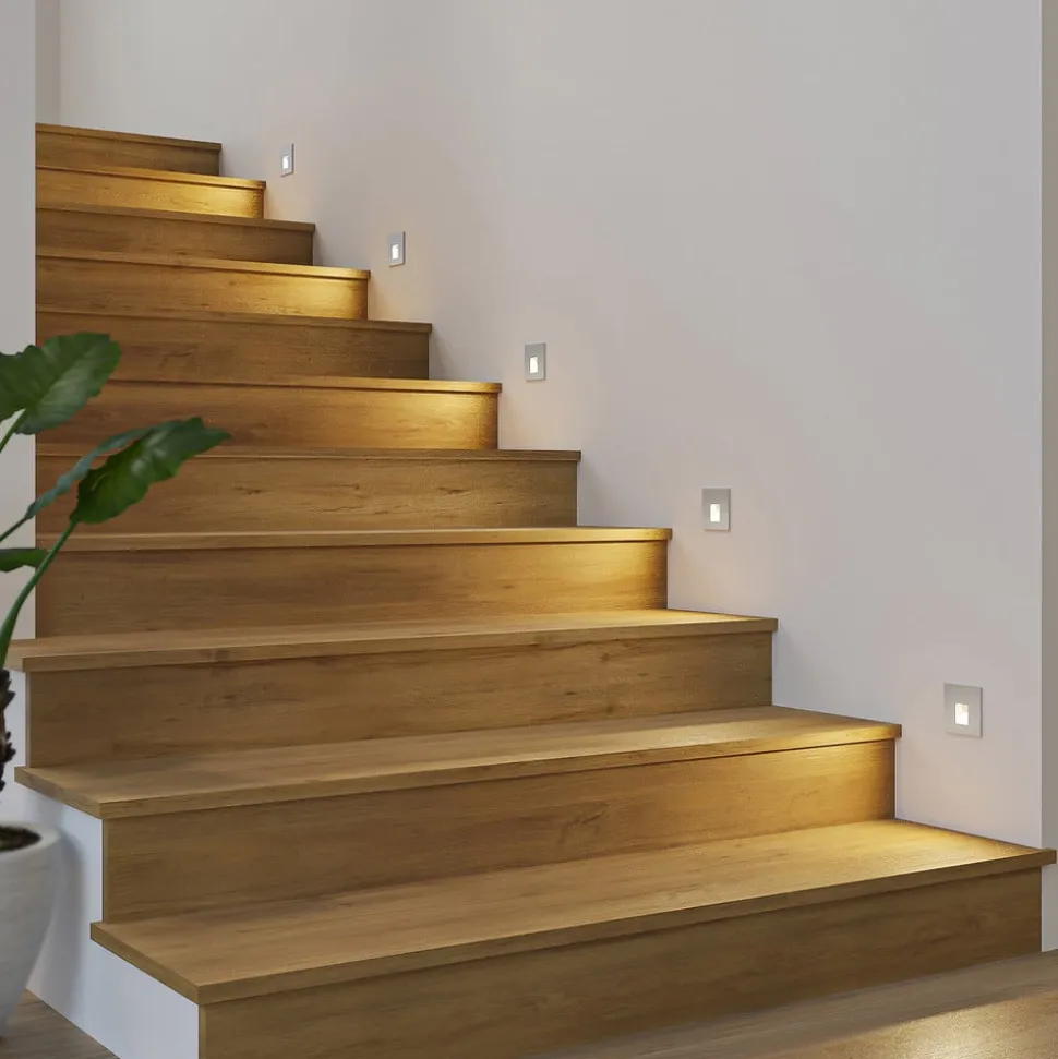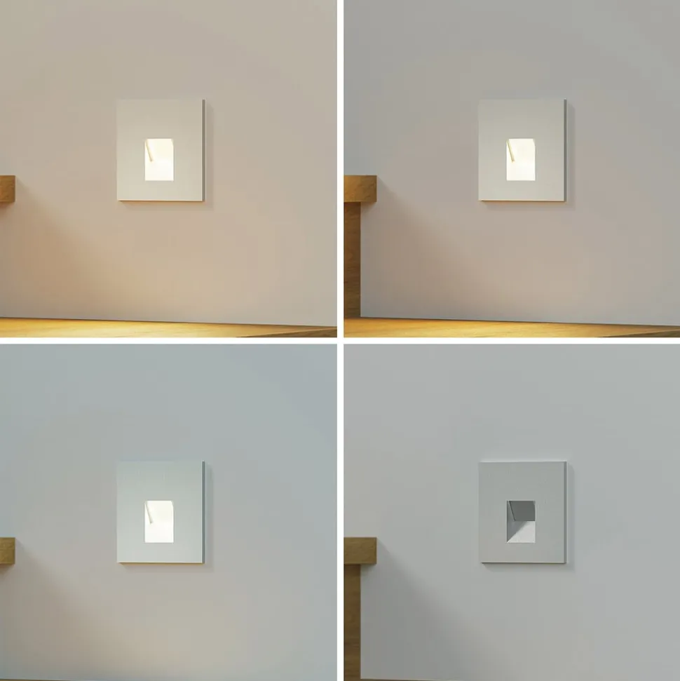 Hoekige LED wand inbouwlamp Vexi van aluminium in zilver De LED wand inbouwlamp Vexi zorgt voor een betrouwbare verlichting van trappenhuizen of gangen en voorkomt gevaarlijk struikelgevaar. De armatuur armatuur wordt in de muur geïnstalleerd en laat een slanke, vierkante plaat achter in het midden waarvan de permanent geïnstalleerde LED’s met goede kleurweergave zich bevinden en naar beneden spotten om verblinding te voorkomen. Deze LED’s kunnen met een dipswitch aan de achterkant worden ingesteld op een specifieke lichtkleur (2.700 K, 3.000 K en 4.000 K) zodat ze kunnen worden aangepast aan persoonlijke behoeften. De zilveren kleur van de Vexi LED wand inbouwlamp rondt het eenvoudige ontwerp af en integreert zich moeiteloos in de meest uiteenlopende interieurstijlen – CCT – doorvoerbedrading mogelijk