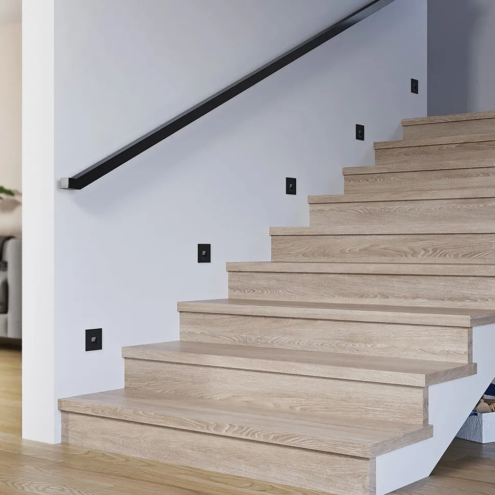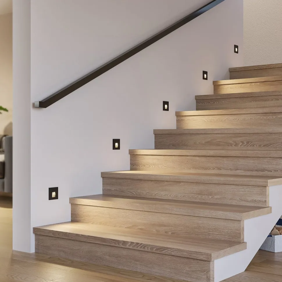 Discrete LED wand inbouwlamp Vexi in zwart aluminium Vexi is de perfecte metgezel als het gaat om het verlichten van trappen of gangen en helpt bij het verlichten van potentieel struikelgevaar. Ze is gemaakt van aluminium en heeft een compact, hoekig ontwerp. De armatuur verdwijnt bijna volledig in de muur en laat alleen een vierkante plaat op het muuroppervlak achter. De lichtkleur van de LED’s kan worden ingesteld met een dipswitch aan de achterkant (2.700 K, 3.000 K en 4.000 K). Met haar eenvoudige ontwerp past de Vexi LED wand inbouwlamp gemakkelijk in de interieurstijl en kan ze gecombineerd worden met andere lampen uit de serie – goede kleurweergave CRI > 90 – CCT – doorvoerbedrading mogelijk