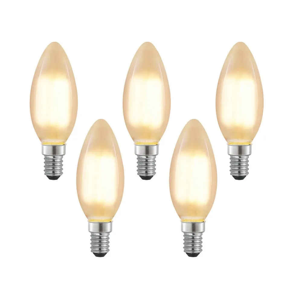 LED kaarslamp E14 4W, warmwit (2.700 K), dimbaar, met mat glas in een set van 5 Deze LED lamp zorgt voor een goede verlichting die niet verblindt dankzij het matglas. Het vermogen is vergelijkbaar met dat van een traditionele gloeilamp, hoewel LED-technologie zuiniger is qua verbruik. De lichtsterkte van de lamp kan worden aangepast met een standaard wanddimmer – Dimbaar met fase afsnijdimmer – Geleverd in een praktische set van 5 lampen