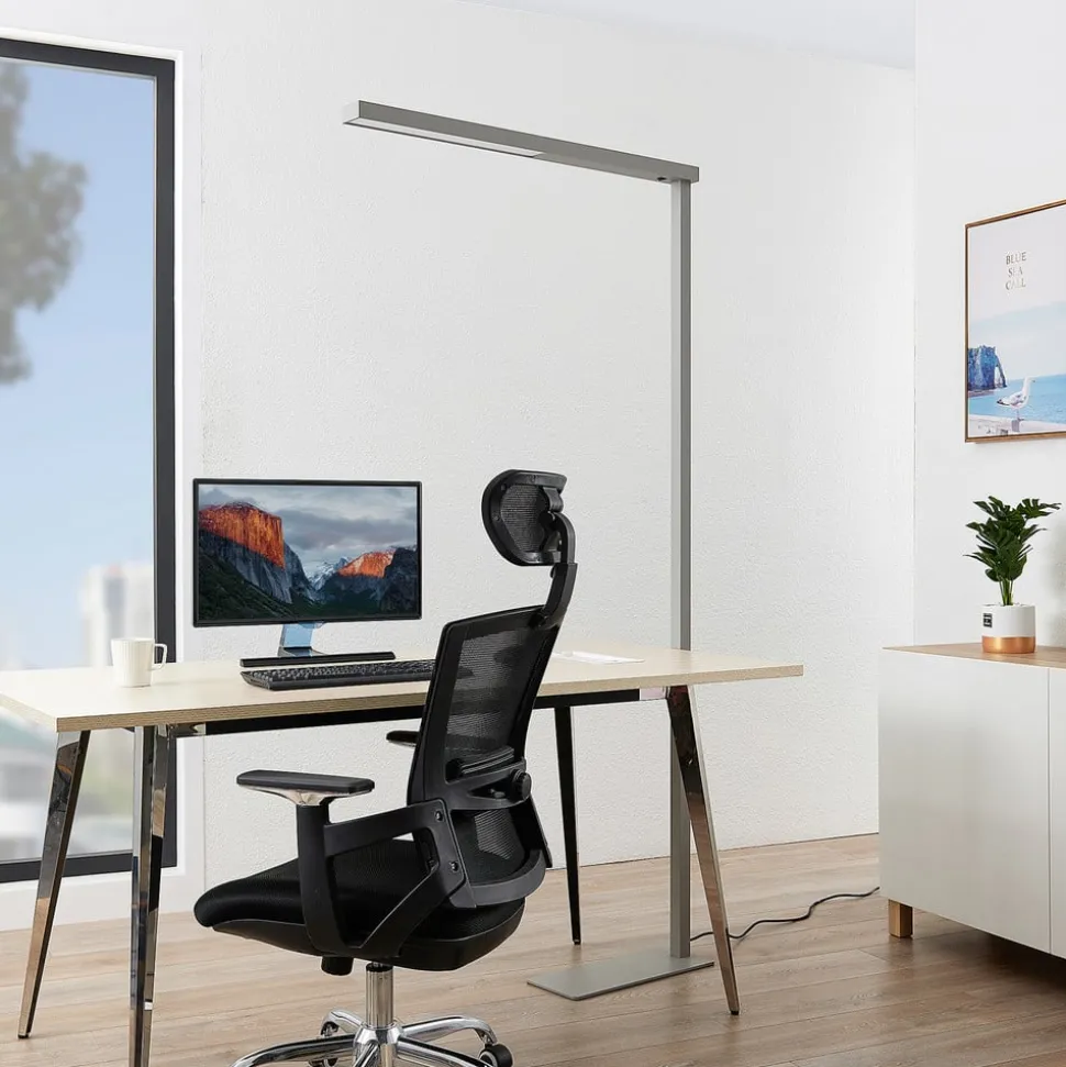 LED kantoor vloerlamp Tamilo met zilverkleurig oppervlak (RAL 9006), schakelaar en directe/indirecte lichtuitstraling Tamilo is een praktische aanvulling op elk kantoor thuis en zorgt voor goede lichtomstandigheden op de werkplek en een natuurlijk ogende lichtuitstraling dankzij de relatief gelijke verhoudingen van direct en indirect licht. De universeel witte lichttemperatuur biedt extra ondersteuning voor geconcentreerd werken. Ondanks het lage energieverbruik zorgen de LED’s voor een goede helderheid, wat zeer gebruiksvriendelijk is. De behuizing van de slanke LED vloerlamp voor kantoorkamers is zilverkleurig gelakt en past daarom goed in de meeste omgevingen.
