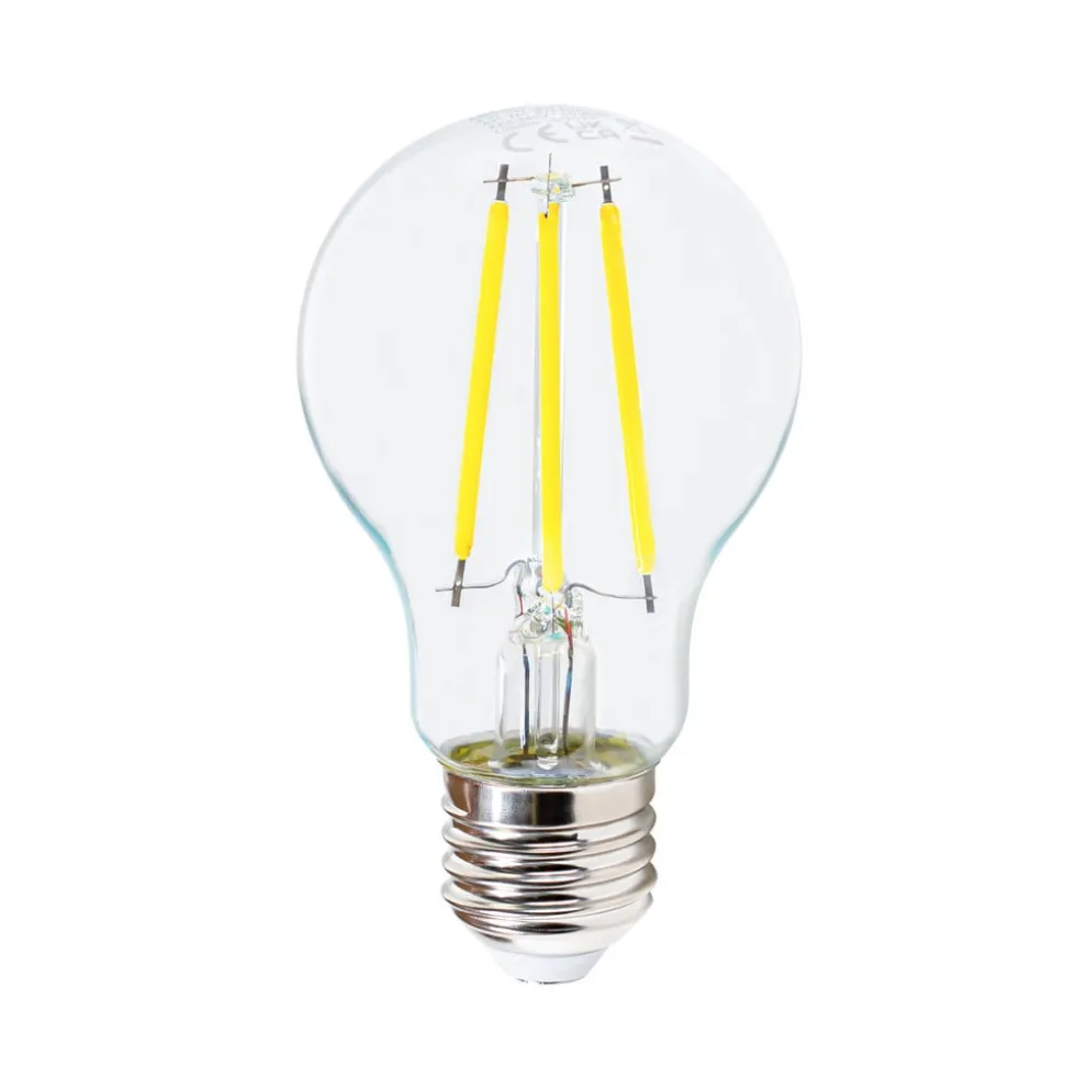 E27 LED lamp in gloeilamp-look, hoge energie-efficiëntie Deze LED lamp voor een E27 fitting is ontworpen in de populaire gloeilamp-look en heeft een heldere glazen bol die goed past in open armaturen. Met zijn warmwitte lichtkleur is hij bijzonder geschikt voor het verlichten van woonruimten – warmwit licht (2.700 K) – hoge schakelstabiliteit met tot wel 100.000 schakelcycli – hoogste energie-efficiëntieklasse A