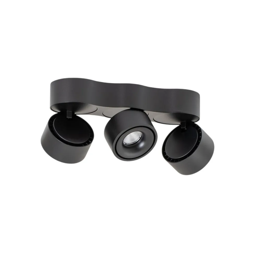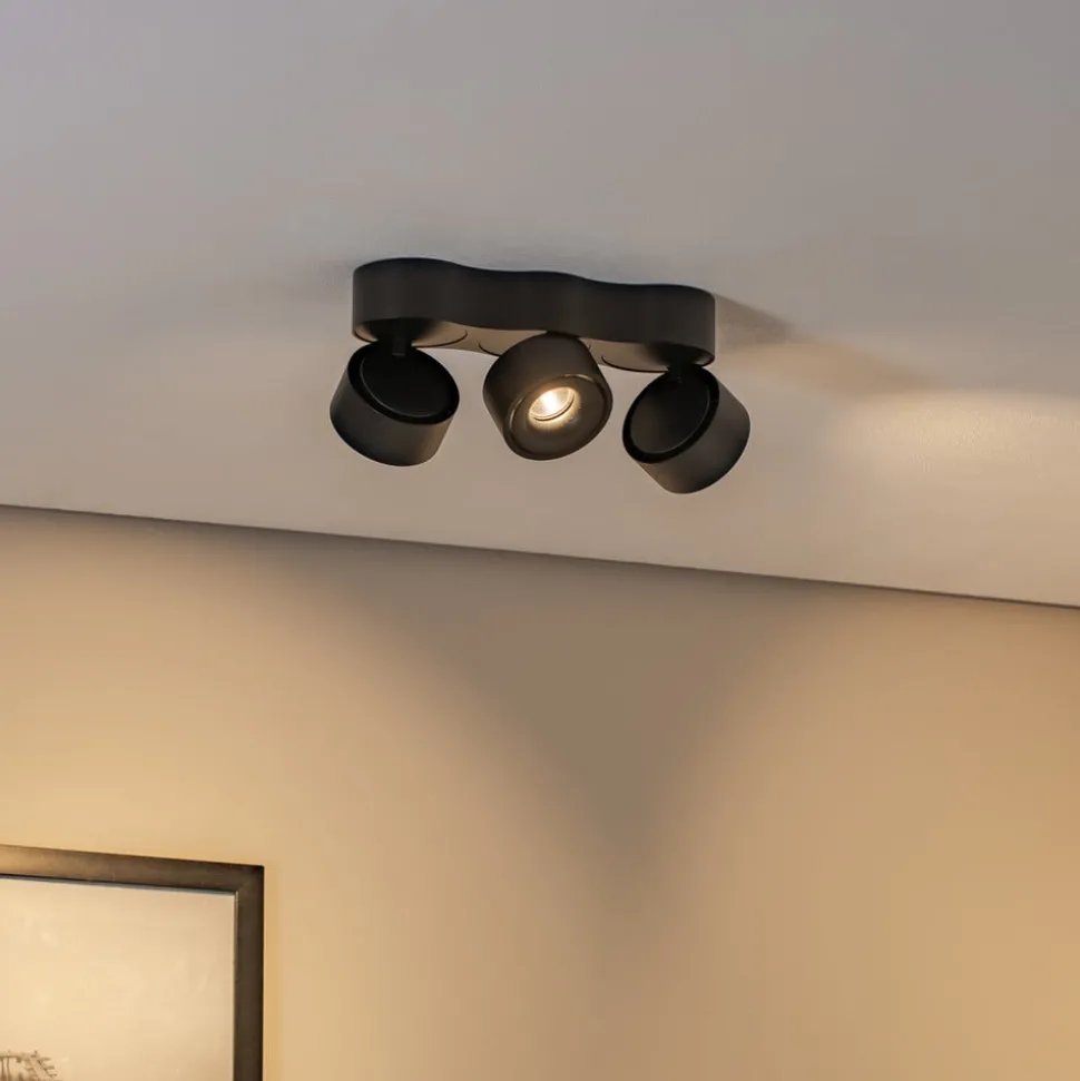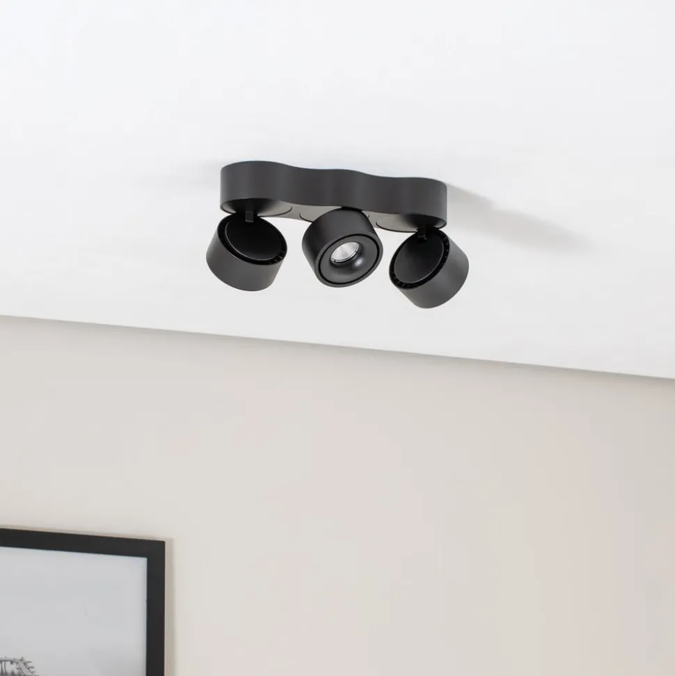 Rotari 3-lamps LED plafondlamp met verstelbare lampenkoppen, dimbaar, CRI 80 Deze LED plafondlamp met zijn warmwitte LED’s heeft een modern ontwerp en kan in veel woon- en commerciële ruimtes worden gebruikt om efficiënt licht te geven. De drie ronde, compacte kappen staan op een rij naast elkaar en kunnen naar wens worden versteld en gedraaid om het licht beter te richten. De hoge CRI zorgt ook voor een bijzonder goede kleurweergave, zelfs als er geen daglicht meer binnenvalt en je alleen moet vertrouwen op het kunstlicht van de LED’s. De plafondlamp is uitgerust met reflectorlampen zodat het licht beter wordt gericht in de ruimte en het zwarte oppervlak heeft een tijdloze uitstraling. Dit maakt de Rotari plafondlamp tot een lichtbron die niet alleen in woonkamers kan worden gebruikt, maar ook in gangen of keukens.