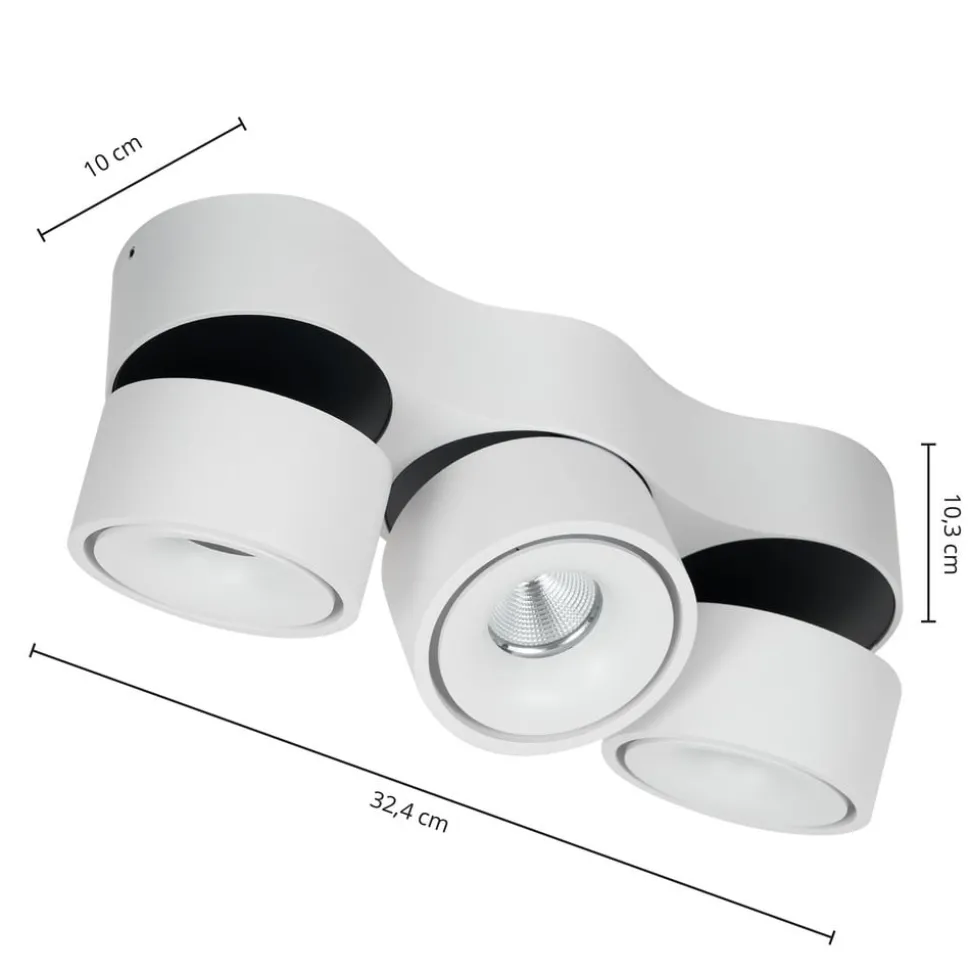 Rotari LED plafondlamp 3-lamps met verstelbare lampenkoppen, dimbaar, CRI 90 Deze LED plafondlamp met zijn warmwitte LED’s heeft een modern ontwerp en kan in veel woon- en commerciële ruimtes worden gebruikt om efficiënt licht te geven. De drie ronde, compacte kappen zijn op een rij naast elkaar geplaatst en kunnen naar wens worden versteld en gedraaid om het licht beter te richten. De hoge CRI zorgt ook voor een bijzonder goede kleurweergave, zelfs als er geen daglicht meer binnenvalt en je alleen moet vertrouwen op het kunstlicht van de LED’s. De plafondlamp is uitgerust met reflectorlampen zodat het licht beter wordt gericht in de ruimte en het witte oppervlak een tijdloze uitstraling heeft. Dit maakt de Vroni LED plafondlamp een lichtbron die niet alleen in woonkamers kan worden gebruikt, maar ook in gangen of keukens.