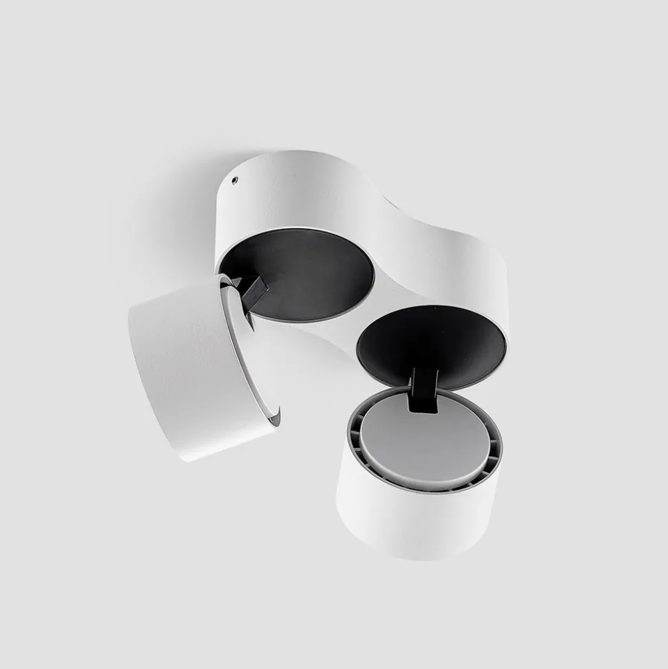 Witte Rotari LED plafondspot met twee flexibele spots De 2-lamps Rotari LED plafondspot heeft een aluminium behuizing met een ingebouwde reflectorlamp in het midden. Met een stralingshoek van 34° straalt hij een warmwit licht (3.000 K) de kamer in. Die armatuur heeft ook een Cri Cri waarde > 90 en dus een hoge kleurweergave. Rotari kan ook specifieke gebieden in een kamer verlichten, omdat de lampenkop 350° kan draaien en 90° kan zwenken. Deze KLEINER spot is daarom niet alleen geschikt voor privé woonruimtes, maar ook voor commerciële ruimtes.