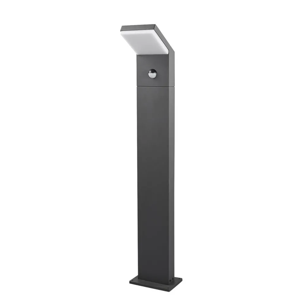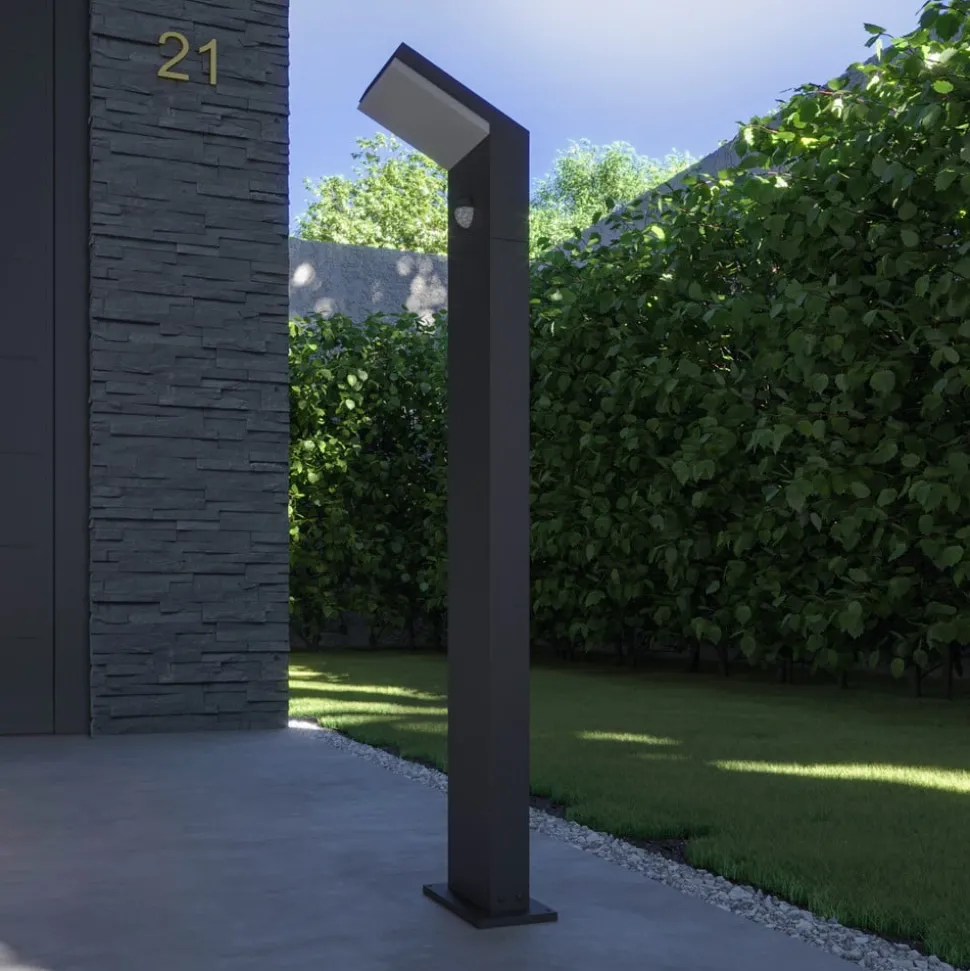 Grafietgrijze LED tuinpadverlichting Yolena met geïntegreerde bewegingsmelder Yolena heeft een moderne uitstraling omdat alles aan de padverlichting bijzonder rechtlijnig is. De aluminium behuizing heeft een grafietgrijze afwerking en de heldere, energiebesparende LED’s bevinden zich in het bovenste deel, dat een afgeschuinde vorm heeft. Ze schijnen dus vooral naar beneden en bieden goed oriëntatielicht voor binnenplaatsen en opritten. Wie wil dat de lamp alleen inschakelt wanneer dat nodig is, zal blij zijn met de geïntegreerde bewegingsmelder. Deze reageert op beweging in een hoek van 150° en binnen een bereik van maximaal 12 meter. De lichtduur kan worden aangepast en kan worden ingesteld tussen 5 seconden en 8 minuten.