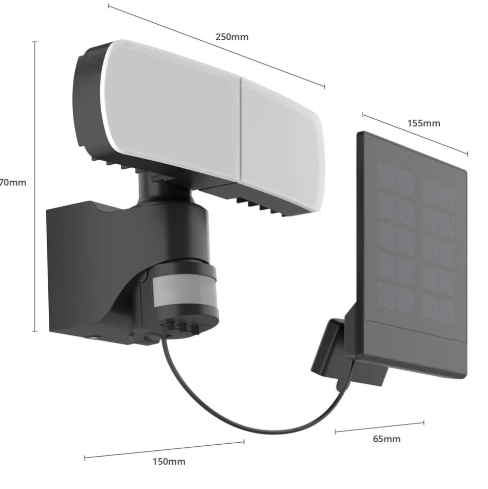 Verder zijn hier een schemersensor en een bewegingsmelder geïntegreerd. De detectiehoek is 110° en de detector kan bewegingen registreren op een maximale afstand van 12 meter. De verlichtingsduur kan individueel worden ingesteld tussen 10 en 60 seconden.