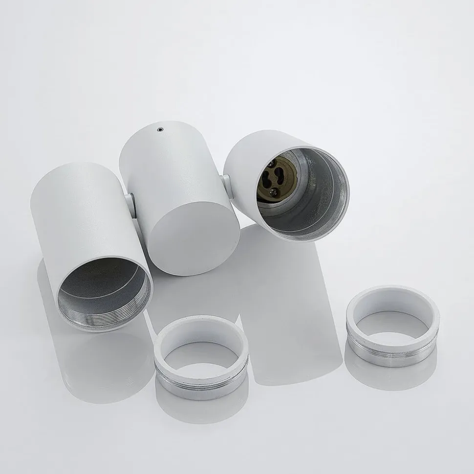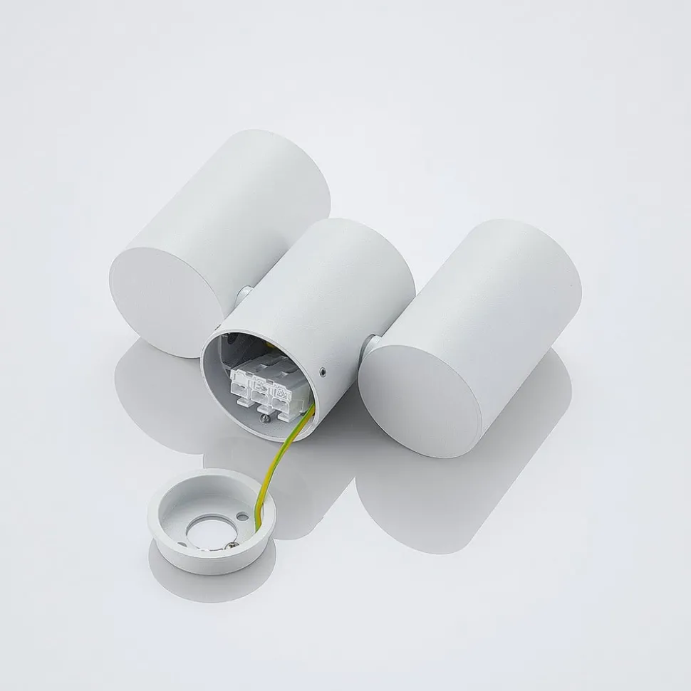 Gesina 2-lamps LED plafondlamp met zwenkbare spots in wit Deze LED plafondlamp is volledig wit, waardoor ze een zeer eigentijdse en toch discrete look heeft. De twee cilindrische spots bevinden zich links en rechts van de eveneens cilindrische plafondhouder. Ze zijn er echter niet star aan bevestigd, maar via een scharnier en kunnen naar wens worden gedraaid. Dit heeft als voordeel dat het lichtpatroon beter kan worden aangepast aan de omstandigheden ter plaatse. Het licht is puntvormig en gericht, hoewel dit ook afhangt van de keuze van de GU10 lamp en de stralingshoek ervan.