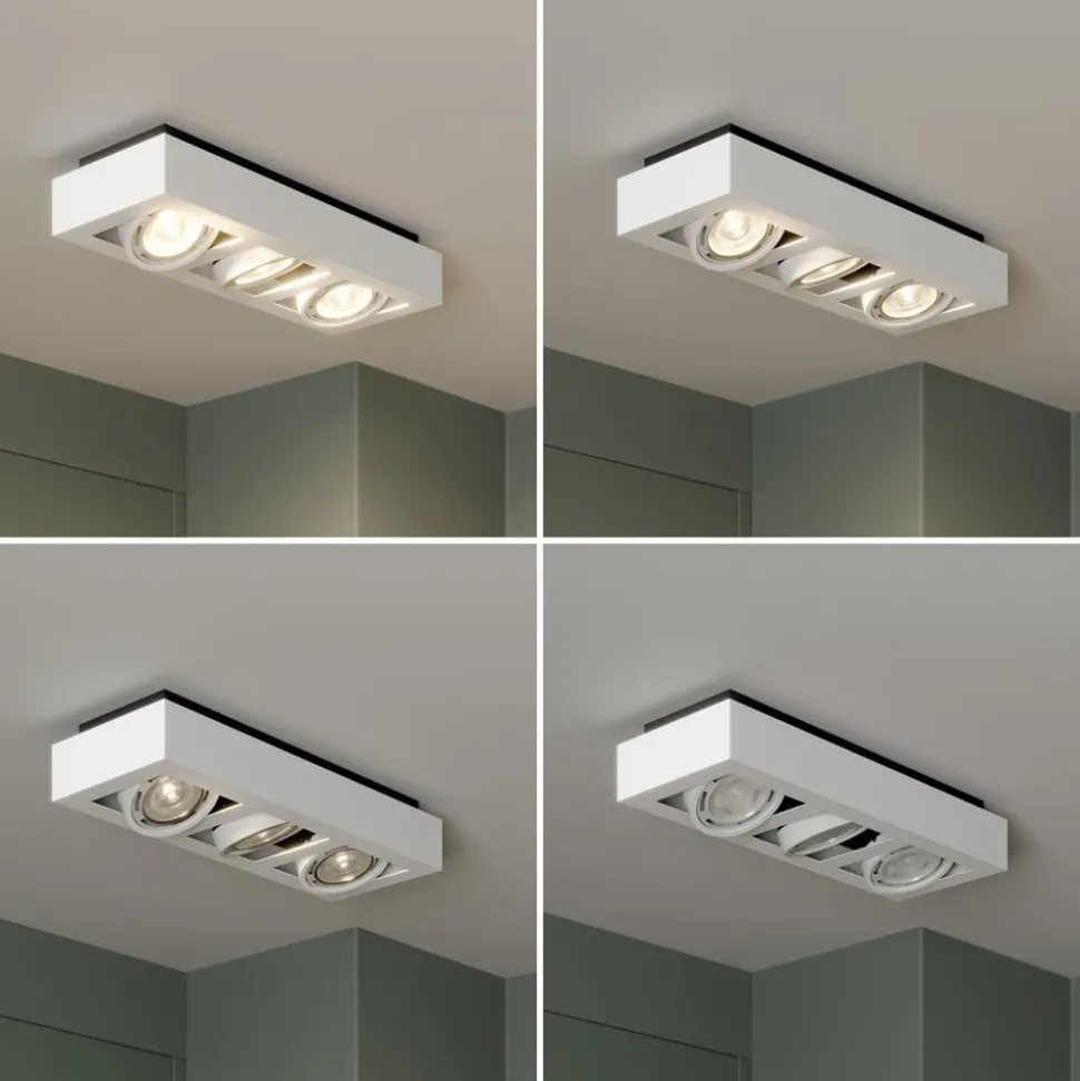 Ronka witte plafondlamp voor GU10 lampen De drie inzetstukken van deze plafondspot zijn allemaal draaibaar en voorzien van krachtige, energiebesparende GU10 lampen. In de 3-lamps versie produceert de plafondlamp een zeer helder licht, waardoor deze witte plafondlamp ideaal is voor sfeerverlichting in de kamer. De lamp is ook geschikt voor gebruik in een commerciële omgeving, bijvoorbeeld als winkelverlichting. Bovendien is de ingebouwde aansluitklem schroefloos, zodat enkele, fijne en geslagen geleiders snel en veilig zonder gereedschap kunnen worden aangesloten. De Ronka plafondlamp heeft een discrete, functionele uitstraling die mooi op de achtergrond past en op verschillende manieren kan worden gebruikt.