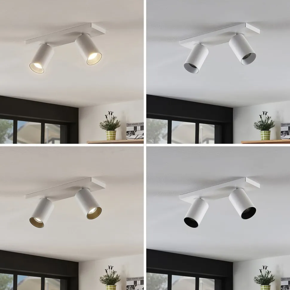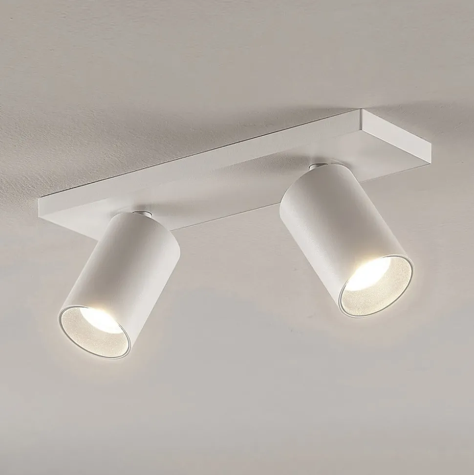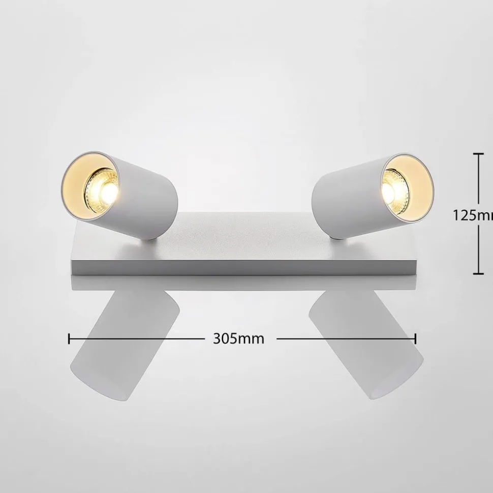De witte lamp Brinja bestaat uit twee cilindervormige spots die beide 90 graden kunnen worden gekanteld en 350 graden om hun eigen as kunnen worden gedraaid. De spots zijn bevestigd aan een rechthoekige houder, waardoor ze zowel aan wanden als aan plafonds kunnen worden bevestigd.