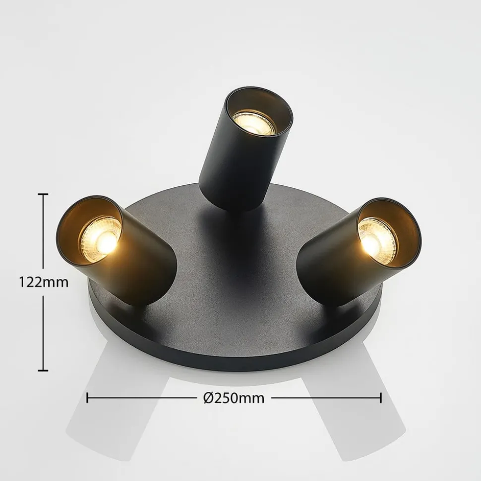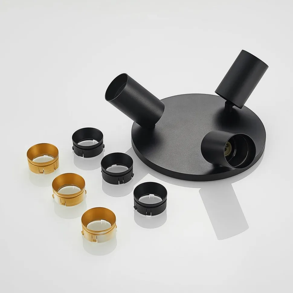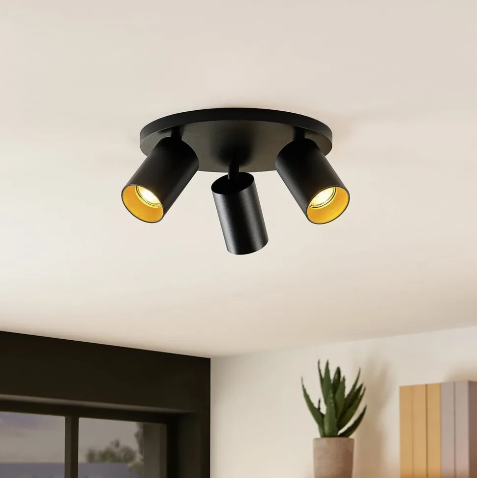 De plafondspot Brinja bestaat uit een ronde plafondhouder waaraan drie cilindervormige lichtbronnen zijn bevestigd. Deze kunnen naar wens worden voorzien van GU10-lampen. De drie spotkoppen kunnen flexibel tot 90 graden worden gekanteld en tot 350 graden worden gedraaid, wat een nauwkeurige verlichting van bepaalde ruimtes of objecten garandeert. Bovendien worden zwarte en gouden sierringen voor de spots meegeleverd.
