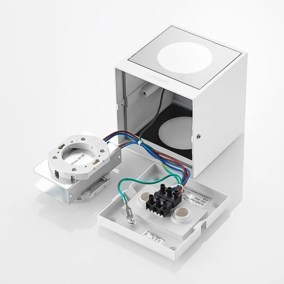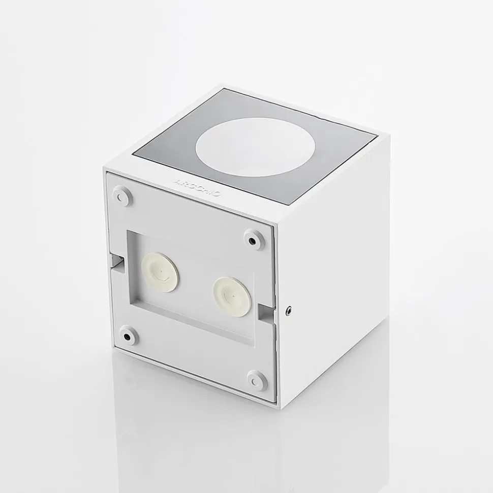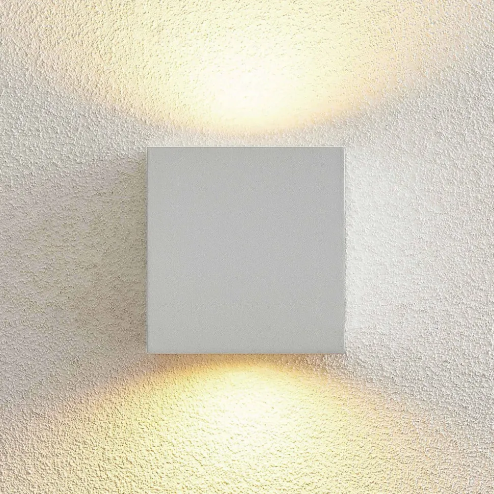 Witte buitenwandlamp Tassnim van aluminium in een kubusvorm Die buitenwandlamp Tassnim maakt indruk met haar moderne en symmetrische ontwerp. Ze is gemaakt van wit aluminium en de buitenkant van de armatuur doet denken aan een kubus. Het gebruik van de juiste lamp garandeert een betrouwbare verlichting van een terras of oprit. Die IP65 beschermingsgraad maakt de lamp aantoonbaar stof- en waterdicht. Deze eigenschappen maken de Tassnim buitenwandlamp perfect voor buitenruimtes en trotseren de weersomstandigheden buiten. Door haar eenvoudige uiterlijk is ze ook perfect voor gebruik op buitenmuren zonder de rest van de architecturale stijl te overschaduwen.