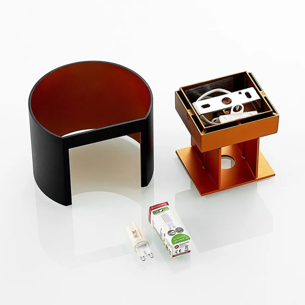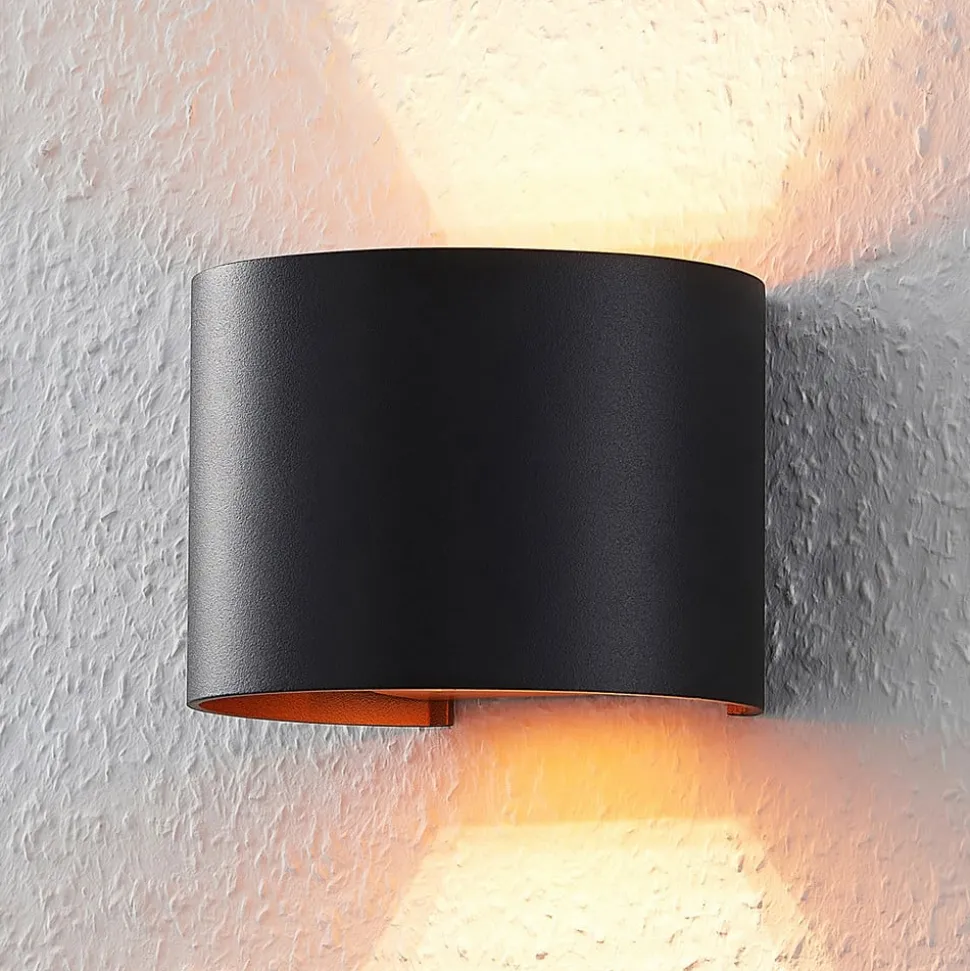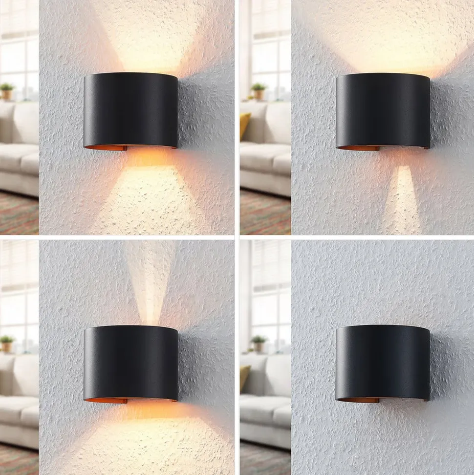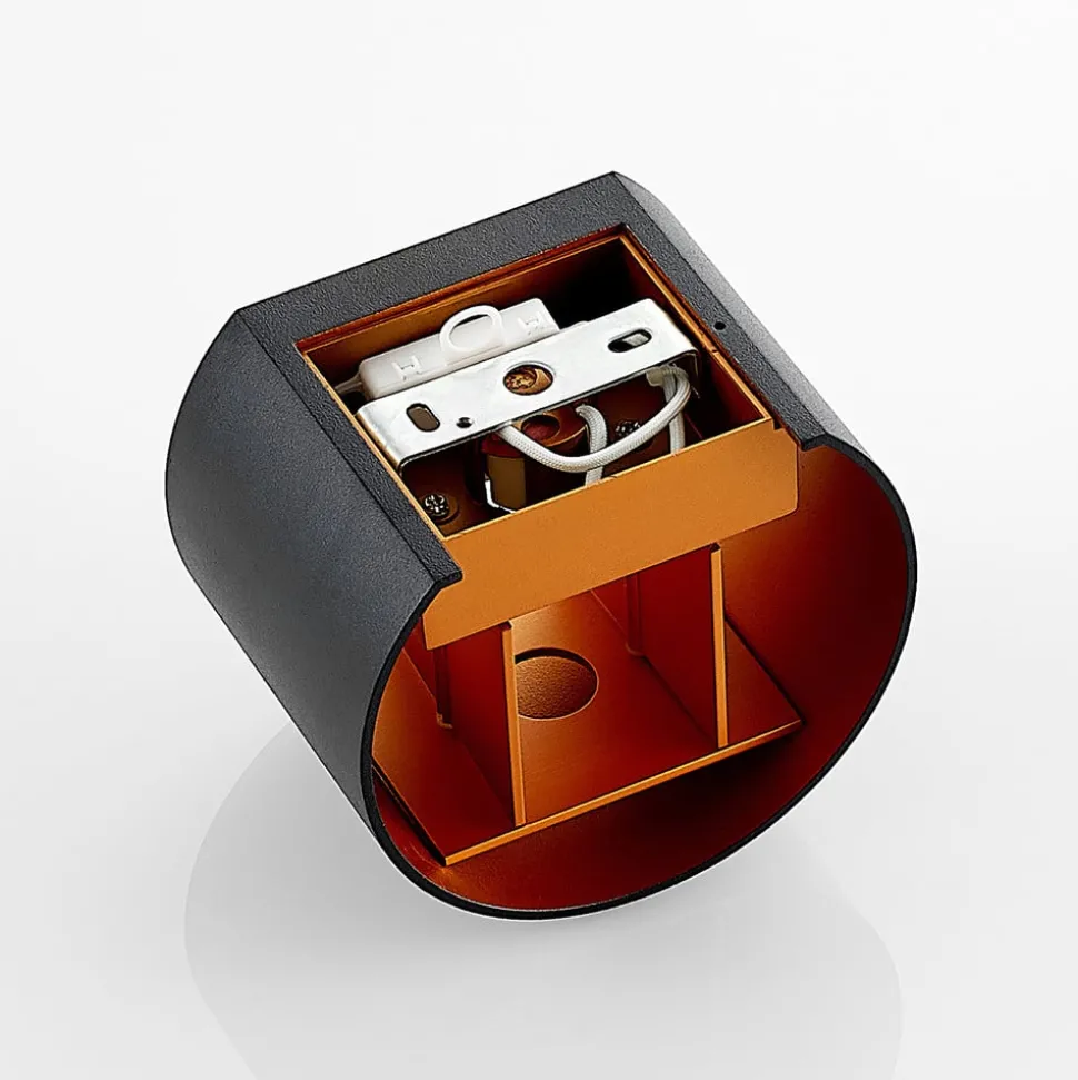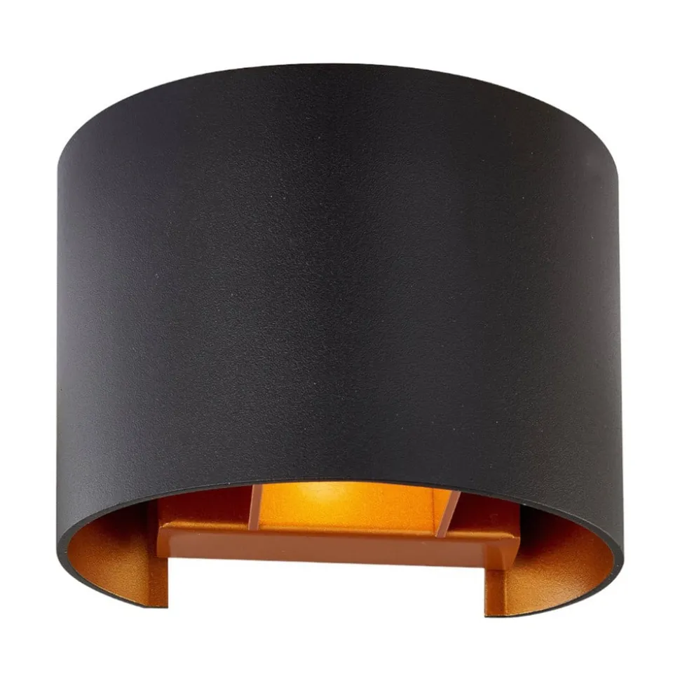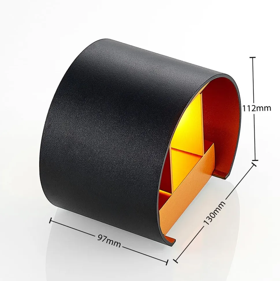 Cilindrische L-wandlamp Zuzana met variabele lichtuitstralingshoek en gouden binnenkant De behuizing van Zuzana is gemaakt van zwart gelakt aluminium aan de buitenkant, terwijl de binnenkant goudkleurig getint is en een zeer warme lichtuitstraling creëert. Bij gebruik van een geschikte dimbare lamp en een externe dimmer kan de helderheid naar wens worden aangepast en kan ook de hoek van de lichtemissie aan de boven- en onderkant worden gewijzigd. Het ontwerp van het verstelmechanisme betekent dat de hoek aan de boven- en onderkant hetzelfde kan blijven of dat smal en breed gecombineerd kunnen worden. Hoe dan ook, het effect is stijlvol en past bij veel woonruimtes in een moderne stijl.